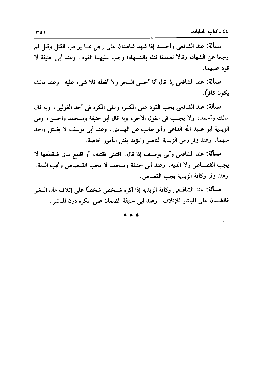 مَسْأَلَةٌ: عِنْدَ الشَّافِعِيِّ يجب القود على المكره وعلى المكره في أحد القولين، وبه قال مالك وَأَحْمَد، ولا يجب في القول الآخر، وبه قال أبو حَنِيفَةَ ومُحَمَّد والحسن، ومن الزَّيْدِيَّة أبو عبد الله الداعي وأبو طالب عن الهادي. وعند أَبِي يُوسُفَ لا يقتل واحد منهما. وعند زفر ومن الزَّيْدِيَّة النَّاصِر والمؤيَّد يقتل المأمور خاصة.