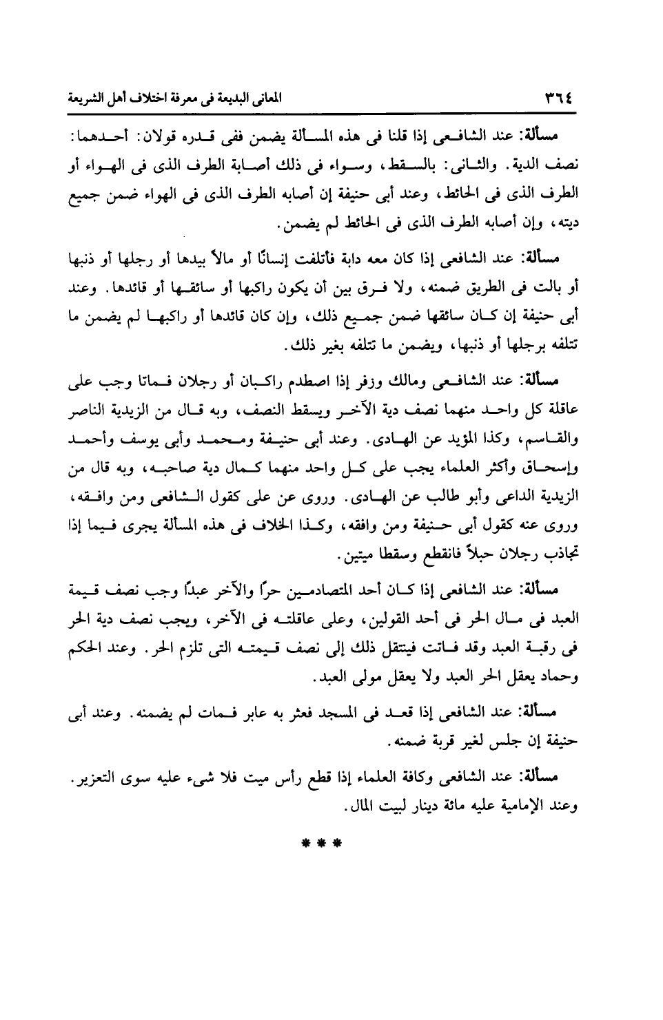 مَسْأَلَةٌ: عِنْدَ الشَّافِعِيِّ وَمَالِك وزفر إذا اصطدم راكبان أو رجلان فماتا وجب على عاقلة كل واحد منهما نصف دية الآخر ويسقط النصف، وبه قال من الزَّيْدِيَّة النَّاصِر والقاسم، وكذا المؤيد عن الهادي. وعند أَبِي حَنِيفَةَ ومُحَمَّد وأَبِي يُوسُفَ وَأَحْمَد وإِسْحَاق وأَكْثَر الْعُلَمَاءِ يجب على كل واحد منهما كمال دية صاحبه، وبه قال من الزَّيْدِيَّة الداعي وأبو طالب عن الهادي. وروى عن علي كقول الشَّافِعِيّ ومن وافقه، وروى عنه كقول أَبِي حَنِيفَةَ ومن وافقه، وكذا الخلاف في هذه المسألة يجري فيما إذا تجاذب رجلان حبلاً فانقطع وسقطا ميتين.