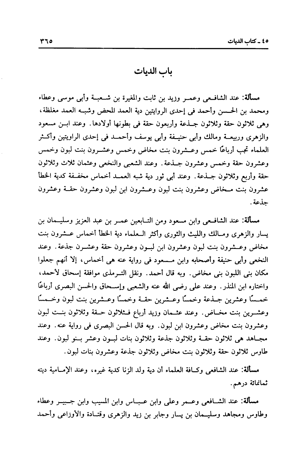 مَسْأَلَةٌ: عِنْدَ الشَّافِعِيِّ وابن مسعود ومن التابعين عمر بن عبد العزيز وسليمان بن يسار والزُّهْرِيّ وَمَالِك واللَّيْث والثَّوْرِيّ وأَكْثَر الْعُلَمَاءِ دية الخطأ أخماس عشرون بنت مخاض وعشرون بنت لبون وعشرون ابن لبون وعشرون حقة وعشرن جذعة. وعند النَّخَعِيّ وأَبِي حَنِيفَةَ وأصحابه وابن مسعود في رِوَايَة عنه هي أخماس، إلا أنهم جعلوا مكان بني اللبون بني مخاض. وبه قال أحمد. ونقل الترمذي موافقة إِسْحَاق لأحمد، واختاره ابن المنذر. وعند علي رضي الله عنه والشعبي وإِسْحَاق والحسن البصري أرباعًا خمسًا وعشرين جذعة وخمسًا وعشرين حقة وخمسًا وعشرين بنت لبون وخمسًا وعشرين بنت مخاض. وعند عثمان وزيد أرباع فثلاثون حقة وثلاثون بنت لبون وعشرون بنت مخاض وعشرون ابن لبون. وبه قال الحسن البصري في رِوَايَة عنه. وعند مجاهد هي ثلاثون حقة وثلاثون جذعة وثلاثون بنات لبون وعشر بنو لبون. وعند طاوس ثلاثون حقة وثلاثون بنت مخاض وثلاثون جذعة وعشرون بنات لبون.