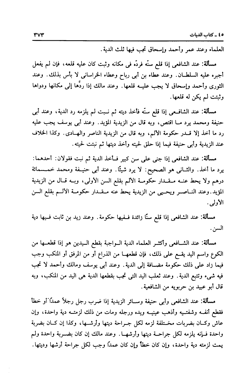 مَسْأَلَةٌ: عِنْدَ الشَّافِعِيِّ وأَبِي حَنِيفَةَ وسائر الزَّيْدِيَّة إذا ضرب رجل رجلاً عمدًا أو خطأ فقطع أنفه وشفتيه وأذهب عينيه ويده ورجله ومات من ذلك لزمته دية واحدة، وإن عاش وكان بضربات مختلفة لزمه لكل جراحة ديتها وأرشها، وكذا إن كان بضربة واحدة فإنه يلزمه لكل جراحة ديتها وأرشها. وعند مالك إن كان بضربة واحدة ولم يمت لزمته دية واحدة، وإن كان خطأ وإن كان عمدًا وجب لكل جراحة أرشها وديتها.