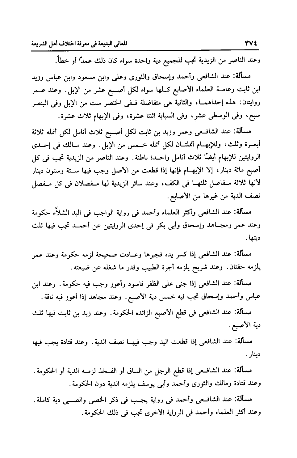 مَسْأَلَةٌ: عِنْدَ الشَّافِعِيِّ وعمر وزيد بن ثابت لكل أصبع ثلاث أنامل لكل أنمله ثلاثة أبعرة وثلث، وللإبهام أنملتان لكل أنمله خمس من الإبل. وعند مالك في إحدى الروايتين للإبهام أيضًا ثلاث أنامل واحدة باطنة. وعند النَّاصِر من الزَّيْدِيَّة تجب في كل أصبع مائة دينار، إلا الإبهام فإنها إذا قطعت من الأصل وجب فيها ستة وستون دينار لأنها ثلاثة مفاصل ثلثها في الكف، وعند سائر الزَّيْدِيَّة لها مفصلان في كل مفصل نصف الدية من غيرها من الأصابع.
