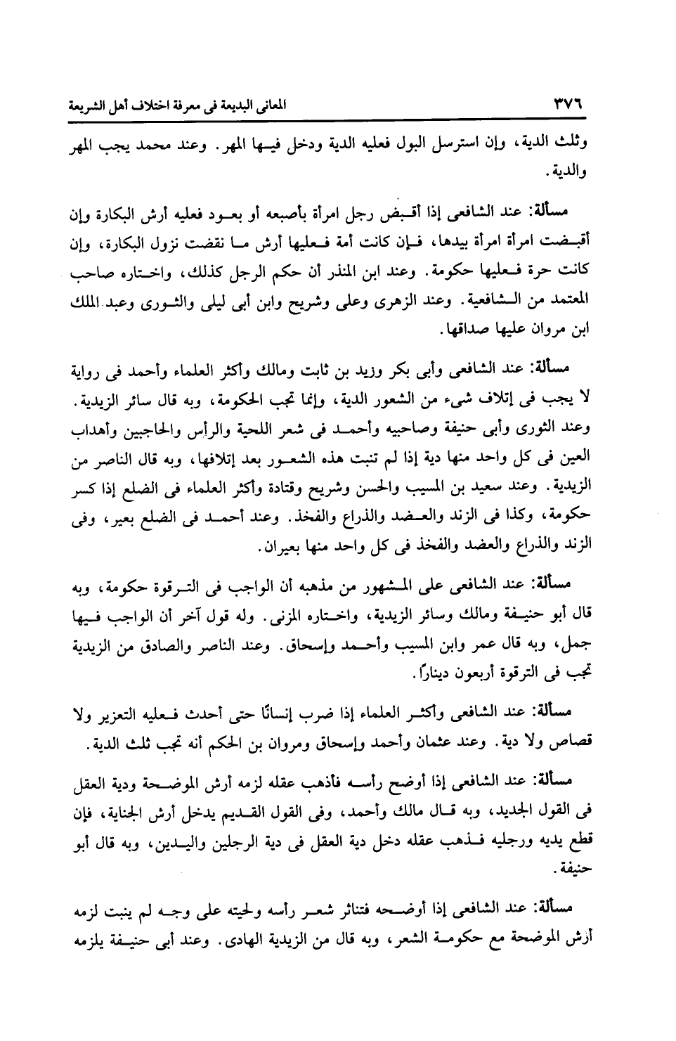 مَسْأَلَةٌ: عِنْدَ الشَّافِعِيِّ وأبي بكر وزيد بن ثابت وَمَالِك وأَكْثَر الْعُلَمَاءِ وَأَحْمَد في رِوَايَة لا يجب في إتلاف شيء من الشعور الدية، وإنَّما تجب الحكومة، وبه قال سائر الزَّيْدِيَّة. وعند الثَّوْرِيّ وأَبِي حَنِيفَةَ وصاحبيه وَأَحْمَد في شعر اللحية والرأس والحاجبين وأهداب العين في كل واحد منها دية إذا لم تنبت هذه الشعور بعد إتلافها، وبه قال النَّاصِر من الزَّيْدِيَّة. وعند سعيد بن المسيب والحسن وشريح وقتادة وأَكْثَر الْعُلَمَاءِ في الضلع إذا كسر حكومة، وكذا في الزند والعضد والذراع والفخذ. وعند أَحْمَد في الضلع بعير، وفي الزند والذراع والعضد والفخذ في كل واحد منها بعيران.