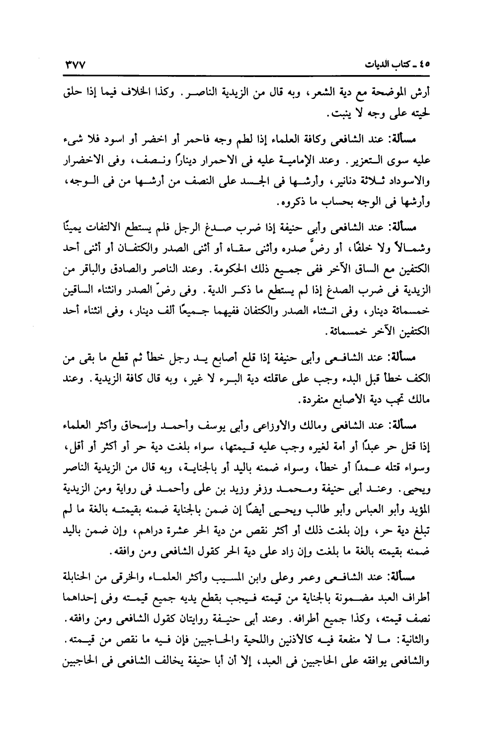 مَسْأَلَةٌ: عِنْدَ الشَّافِعِيِّ وأَبِي حَنِيفَةَ إذا ضرب صدغ الرجل فلم يستطع الالتفات يمينًا وشمالاً ولا خلفًا، أو رضَّ صدره وأثنى سقاه أو أثنى الصدر والكتفان أو أثنى أحد الكتفين مع الساق الآخر ففي جميع ذلك الحكومة. وعند النَّاصِر والصادق والباقر من الزَّيْدِيَّة في ضرب الصاع إذا لم يستطع ما ذكر الدية. وفي رضّ الصدر وانثناء الساقين خمسمائة دينار، وفي انثناء الصدر والكتفان ففيهما جميعًا ألف دينار، وفي انثناء أحد الكتفين الآخر خمسمائة.