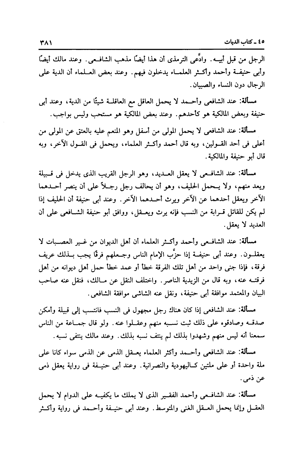 مَسْأَلَةٌ: عِنْدَ الشَّافِعِيِّ وَأَحْمَدَ لا يحمل العاقل مع العاقلة شيئًا من الدية، وعند أبي حَنِيفَةَ وبعض المالكية هو كأحدهم. وعند بعض المالكية هو مستحب وليس بواجب.