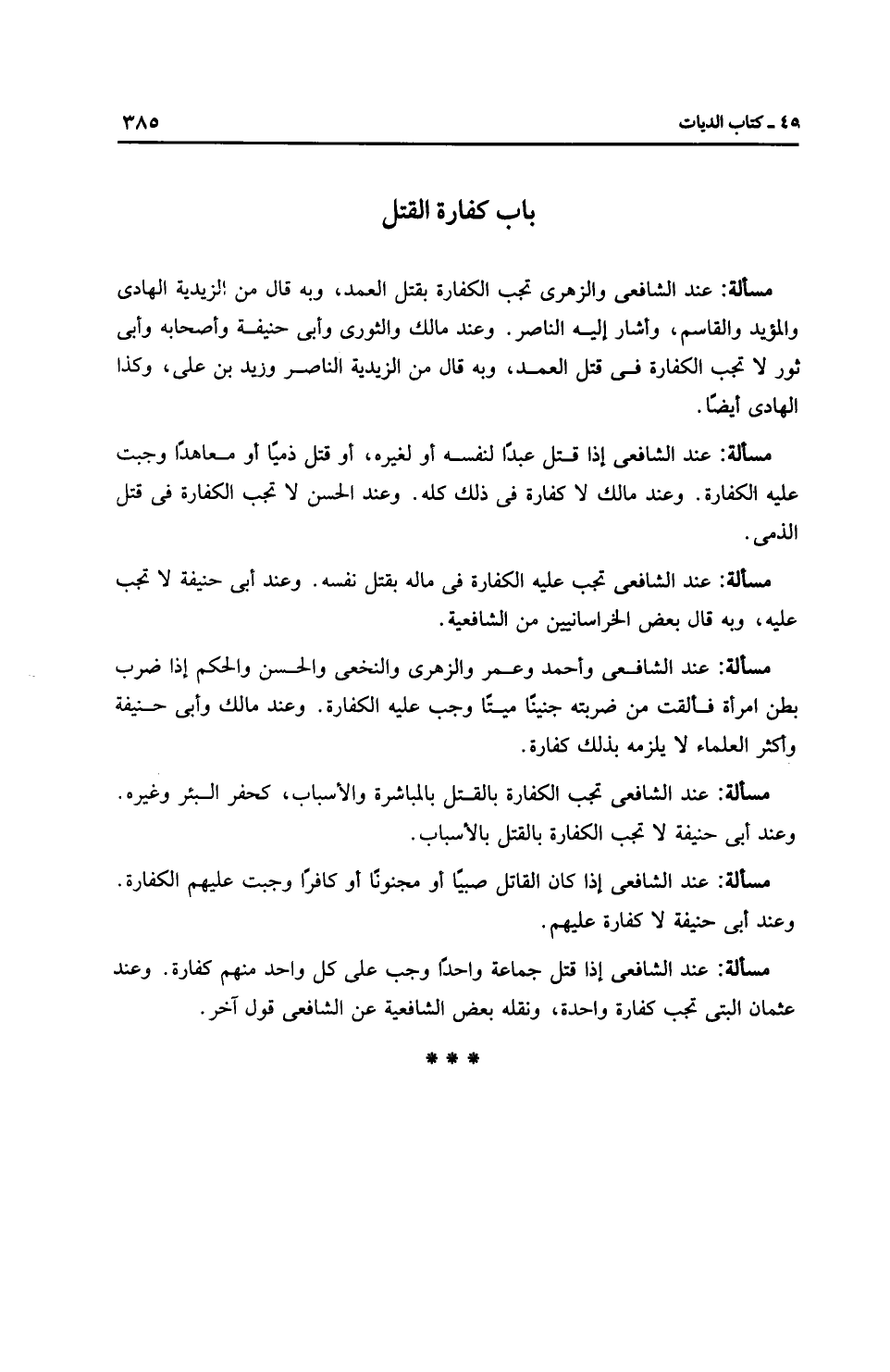 مَسْأَلَةٌ: عِنْدَ الشَّافِعِيِّ إذا قتل جماعة واحدًا وجب على كل واحد منهم كفارة. وعند عثمان البتي تجب كفارة واحدة، ونقله بعض الشَّافِعِيَّة عن الشَّافِعِيّ قول آخر.