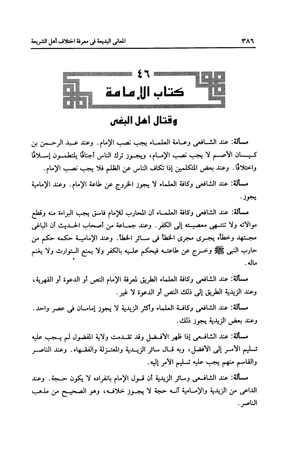 مَسْأَلَةٌ: عِنْدَ الشَّافِعِيِّ وكافة العلماء وأكثر الزَّيْدِيَّة لا يجوز إمامان في عصر واحد. وعند بعض الزَّيْدِيَّة يجوز ذلك.