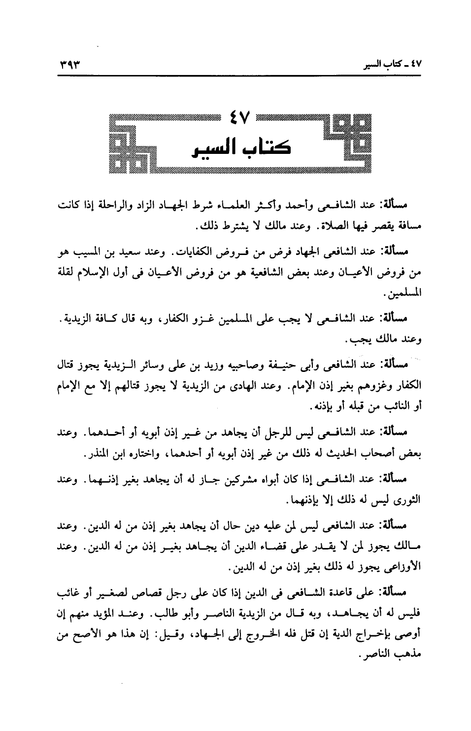 مَسْأَلَةٌ: عِنْدَ الشَّافِعِيِّ وأَبِي حَنِيفَةَ وصاحبيه وزيد بن علي وسائر الزَّيْدِيَّة يجوز قتال الكفار وغزوهم بغير إذن الإمام. وعند الهادي من الزَّيْدِيَّة لا يجوز قتالهم إلا مع الإمام أو النائب من قبله أو بإذنه.