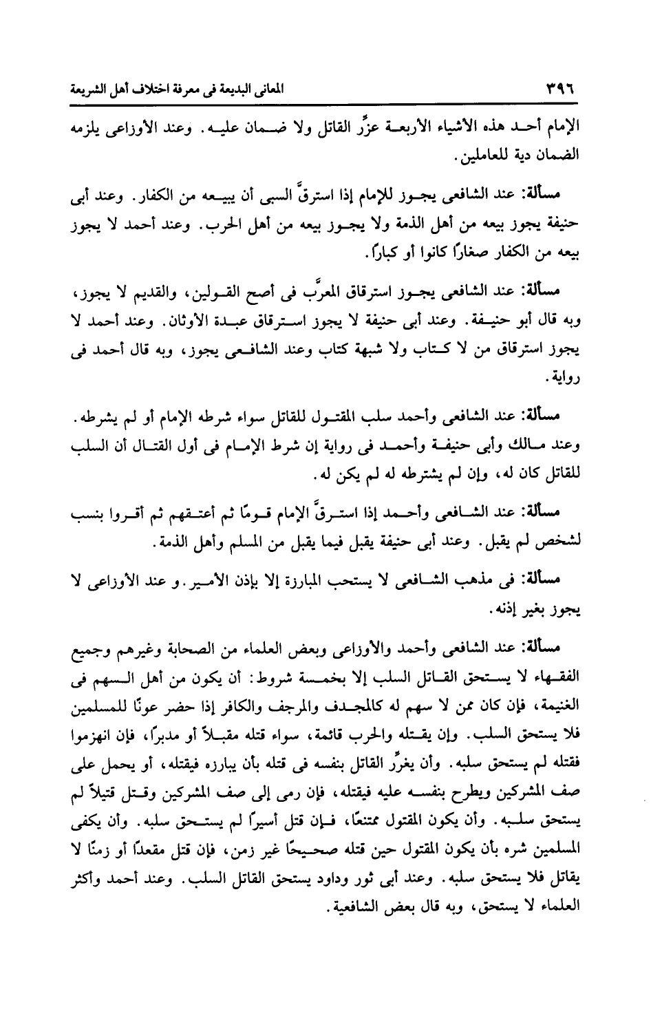 مَسْأَلَةٌ: عِنْدَ الشَّافِعِيِّ وَأَحْمَدَ والْأَوْزَاعِيّ وبعض العلماء من الصحابة وغيرهم وجميع الفقهاء لا يستحق القاتل السلب إلا بخمسة شروط: أن يكون من أهل السهم في الغنيمة، فإن كان ممن لا سهم له كالمجدف والمرجف والكافر إذا حضر عونًا للمسلمين فلا يستحق السلب. وإن يقتله والحرب قائمة، سواء قتله مقبلاً أو مدبرًا، فإن انهزموا فقتله لم يستحق سلبه. وأن يغرِّر القاتل بنفسه في قتله بأن يبارره فيقتله، أو يحمل على صف المشركين ويطرح بنفسه عليه فيقتله، فإن رمى إلى صف المشركين وقتل قتيلاً لم يستحق سلبه. وأن يكون المقتول ممتنعًا، فإن قتل أسيرًا لم يستحق سلبه. وأن يكفي المسلمين شره بأن يكون المقتول حين قتله صحيحًا غير زمن، فإن قتل مقعدًا أو زمنًا لا يقاتل فلا يستحق سلبه. وعند أَبِي ثَورٍ وداود يستحق القاتل السلب. وعند أَحْمَد وأكثر العلماء لا يستحق، وبه قال بعض الشَّافِعِيَّة.