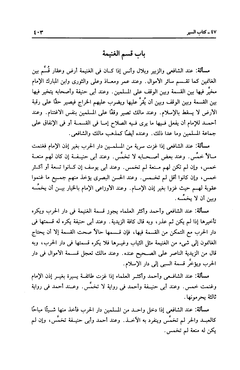 مَسْأَلَةٌ: عِنْدَ الشَّافِعِيِّ وَأَحْمَدَ وأَكْثَر الْعُلَمَاءِ يجوز قسمة الغنيمة في دار الحرب ويكره تأخيرها إذا لم يكن ثم عذر، وبه قال كافة الزَّيْدِيَّة. وعند أَبِي حَنِيفَةَ يكره له قسمتها في دار الحرب مع التمكن من القسمة فيها، فإن قسمها حالاً صحت القسمة إلا أن يحتاج الغانمون إلى شيء من الغنيمة مثل الثياب وغيرها فلا يكره قسمتها في دار الحرب، وبه قال من الزَّيْدِيَّة النَّاصِر على الصحيح عنده. وعند مالك تعجل قسمة الأموال في دار الحرب ويؤخَّر قسمة السبي إلى دار الْإِسْلَام.