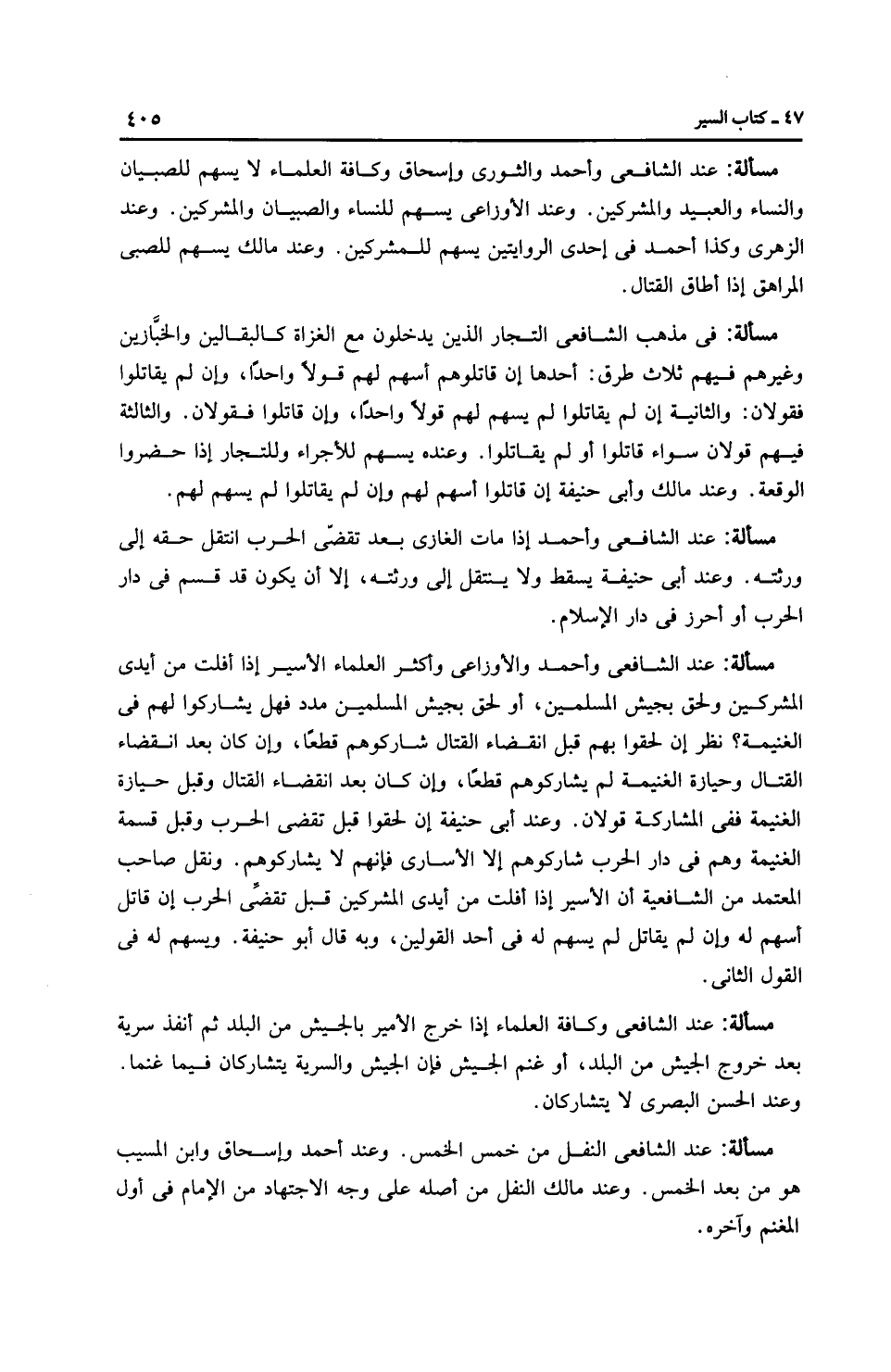 مَسْأَلَةٌ: عِنْدَ الشَّافِعِيِّ وَأَحْمَدَ والثَّوْرِيّ وإِسْحَاق وكافة العلماء لا يسهم للصبيان والنساء والعبيد والمشركين. وعند الْأَوْزَاعِيّ يسهم للنساء والصبيان والمشركين. وعند الزُّهْرِيّ وكذا أَحْمَد في إحدى الروايتين يسهم للمشركين. وعند مالك يسهم للصبي المراهق إذا أطاق القتال.