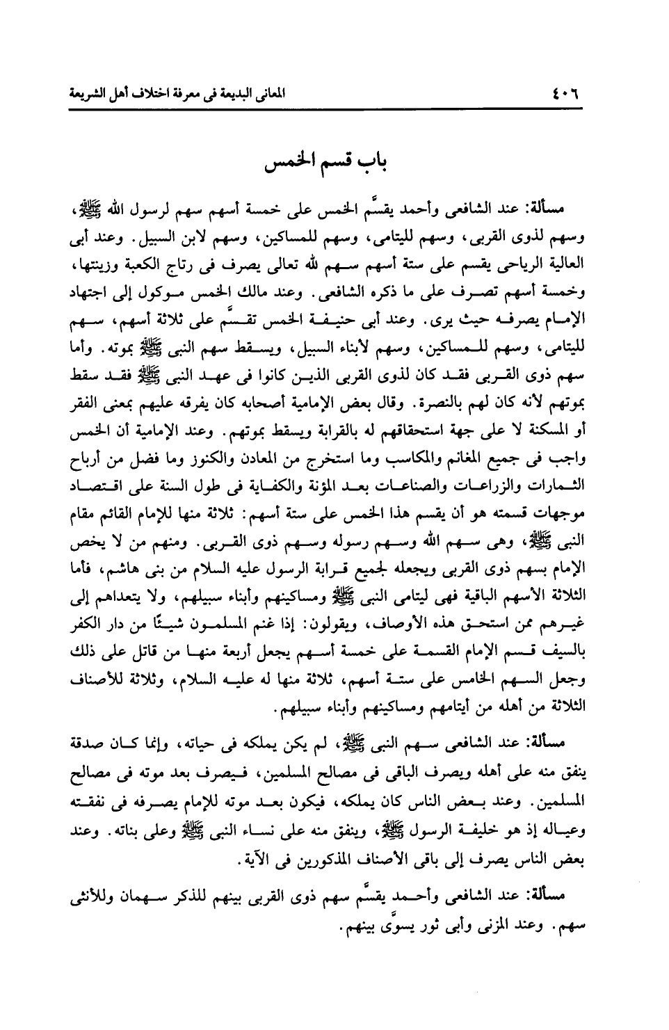 مَسْأَلَةٌ: عِنْدَ الشَّافِعِيِّ وَأَحْمَدَ يقسَّم الخمس على خمسة أسهم سهم لرسول الله - صلى الله عليه وسلم -، وسهم لذوي القربى، وسهم لليتامى، وسهم للمساكين، وسهم لابن السبيل. وعند أبي العالية الرياحي يقسم على ستة أسهم سهم لِلَّهِ تعالى يصرف في رتاج الكعبة وزينتها، وخمسة أسهم تصرف على ما ذكره الشَّافِعِيّ. وعند مالك الخمس موكول إلى اجتهاد الإمام يصرفه حيث يرى. وعند أَبِي حَنِيفَةَ الخمس تقسَّم على ثلاثة أسهم، سهم لليتامى، وسهم للمساكين، وسهم لأبناء السبيل، ويسقط سهم النبي - صلى الله عليه وسلم - بموته. وأما سهم ذوي القربى فقد كان لذوي القربى الذين كانوا في عهد النبي - صلى الله عليه وسلم - فقد سقط بموتهم لأنه كان لهم بالنصرة. وقال بعض الْإِمَامِيَّة أصحابه كان يفرقه عليهم بمعنى الفقر أو المسكنة لا على جهة استحقاقهم له بالقرابة ويسقط بموتهم. وعند الْإِمَامِيَّة أن الخمس واجب في جميع المغانم والمكاسب وما استخرج من المعادن والكنوز وما فضل من أرباح الثمارات والزراعات والصناعات بعد المؤنة والكفاية في طول السنة على اقتصاد موجهات قسمته هو أن يقسم هذا الخمس على ستة أسهم: ثلاثة منها للإمام القائم مقام النبي - صلى الله عليه وسلم -، وهي سهم اللَّه وسهم رسوله وسهم ذوي القربى. ومنهم من لا يخص الإمام بسهم ذوي القربى ويجعله لجميع قرابة الرسول عليه السلام من بني هاشم، فأمَّا الثلاثة الأسهم الباقية فهي ليتامى النبي - صلى الله عليه وسلم - ومساكينهم وأبناء سبيلهم، ولا يتعداهم إلى غيرهم ممن استحق هذه الأوصاف، ويقولون: إذا غنم المسلمون شيئًا من دار الكفر بالسيف قسم الإمام القسمة على خمسة أسهم يجعل أربعة منها من قاتل على ذلك وجعل السهم الخامس على ستة أسهم، ثلاثة منها له عليه السلام، وثلاثة للأصناف الثلاثة من أهله من أيتامهم ومساكينهم وأبناء سبيلهم.