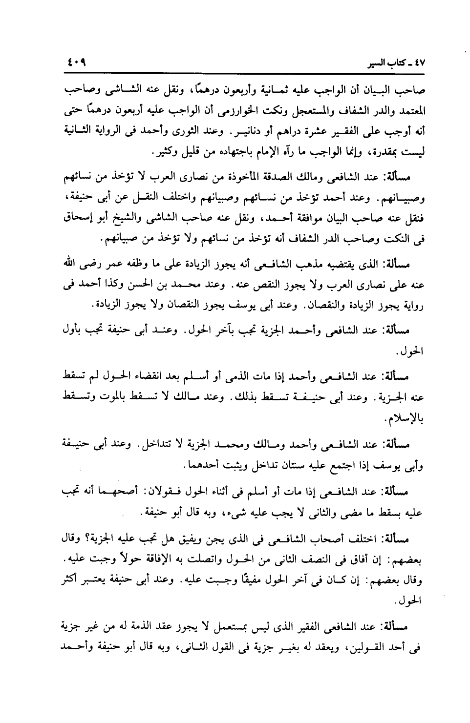 مَسْأَلَةٌ: عِنْدَ الشَّافِعِيِّ وَأَحْمَدَ إذا مات الذمي أو أسلم بعد انقضاء الحول لم تسقط عنه الجزية. وعند أَبِي حَنِيفَةَ تسقط بذلك. وعند مالك لا تسقط بالموت وتسقط بالْإِسْلَام.