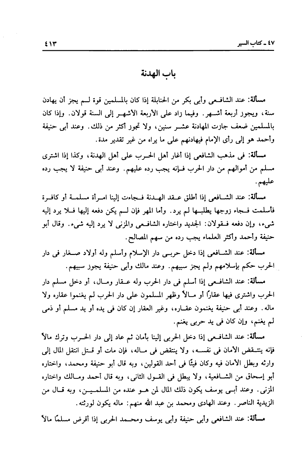 مَسْأَلَةٌ: فِي مَذْهَبِ الشَّافِعِيِّ إذا أغار أهل الحرب على أهل الهدنة، وكذا إذا اشترى مسلم من أموالهم من دار الحرب فإنه يجب رده عليهم. وعند أَبِي حَنِيفَةَ لا يجب رده عليهم.