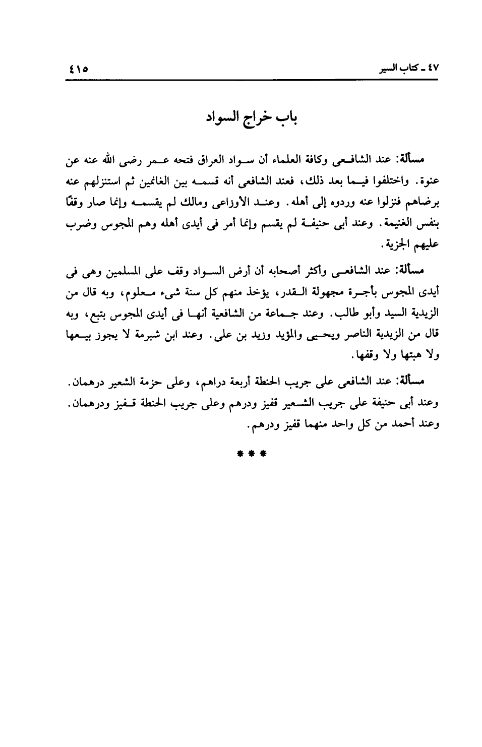 مَسْأَلَةٌ: عِنْدَ الشَّافِعِيِّ وأكثر أصحابه أن أرض السواد وقف على المسلمين وهي في أيدي المجوس بأجرة مجهولة القدر، يؤخذ منهم كل سنة شيء معلوم، وبه قال من الزَّيْدِيَّة السيّد وأبو طالب. وعند جماعة من الشَّافِعِيَّة أنها في أيدي المجوس بتبع، وبه قال من الزَّيْدِيَّة النَّاصِر ويَحْيَى والمؤيَّد وزيد بن علي. وعند ابن شُبْرُمَةَ لا يجوز بيعها ولا هبتها ولا وقفها.