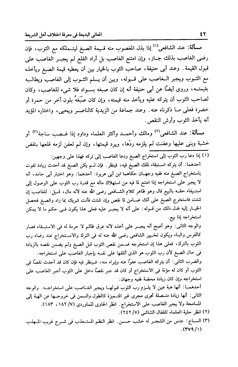 مَسْأَلَةٌ: عِنْدَ الشَّافِعِيِّ إذا بذل المغصوب منه قيمة الصبغ ليتملكه مع الثوب، فإن رضي الغاصب بذلك جاز، وإن امتنع الغاصب بل أراد القلع لم يجبر الغاصب على قبول القيمة. وعند أَبِي حَنِيفَةَ، صاحب الثوب بالخيار بين أن يعطيه قيمة الصبغ ويأخذه مع الثوب ويجبر الغاصب على قبوله، وبين أن يسلم الثوب إلى الغاصب ويطالبه بقيمته، وروى أيضًا عن أَبِي حَنِيفَةَ أنه إن كان صبغه بسواد فلا شيء للغاصب، وكان لصاحب الثوب أن يتركه عليه ويأخذ منه قيمته، وإن كان صَبَغهُ بلون آخر من حمرة أو خضرة فعلى ما ذكرناه عنه. وعند جماعة من الزَّيْدِيَّة كالنَّاصِر ويَحْيَى، واختاره المؤيد أنه يأخذ الثوب وأرش النقص.