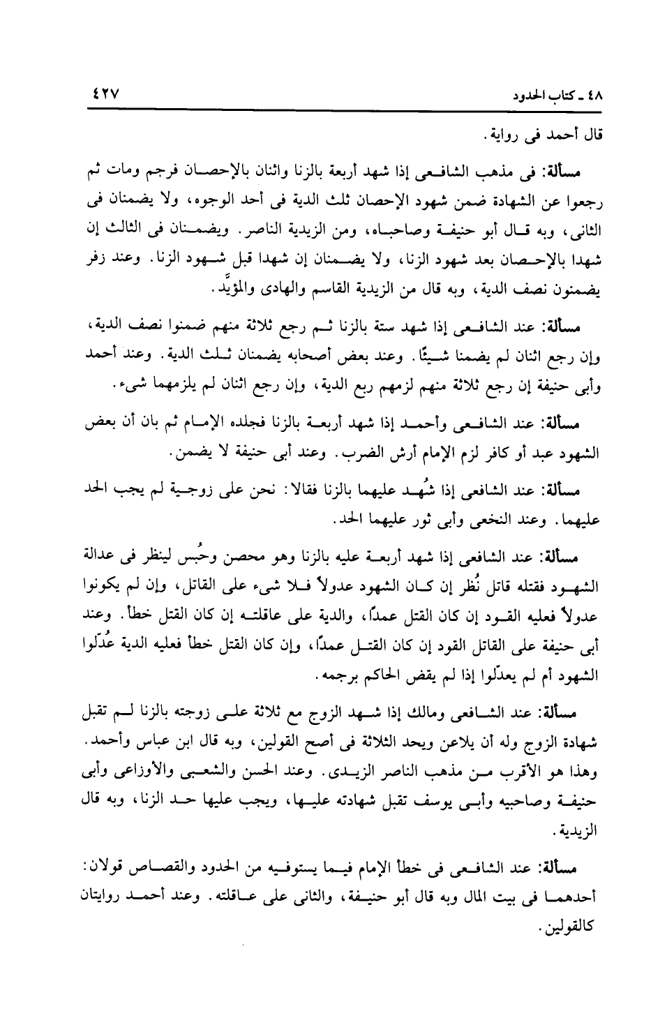 مَسْأَلَةٌ: فِي مَذْهَبِ الشَّافِعِيِّ إذا شهد أربعة بالزنا واثنان بالإحصان فرجم ومات ثم رجعوا عن الشهادة ضمن شهود الإحصان ثلث الدية في أحد الوجوه، ولا يضمنان في الثاني، وبه قال أبو حَنِيفَةَ وصاحباه، ومن الزَّيْدِيَّة النَّاصِر. ويضمنان في الثالث إن شهدا بالإحصان بعد شهود الزنا، ولا يضمنان إن شهدا قبل شهود الزنا. وعند زفر يضمنون نصف الدية، وبه قال من الزَّيْدِيَّة القاسم والهادي والمؤيَّد.