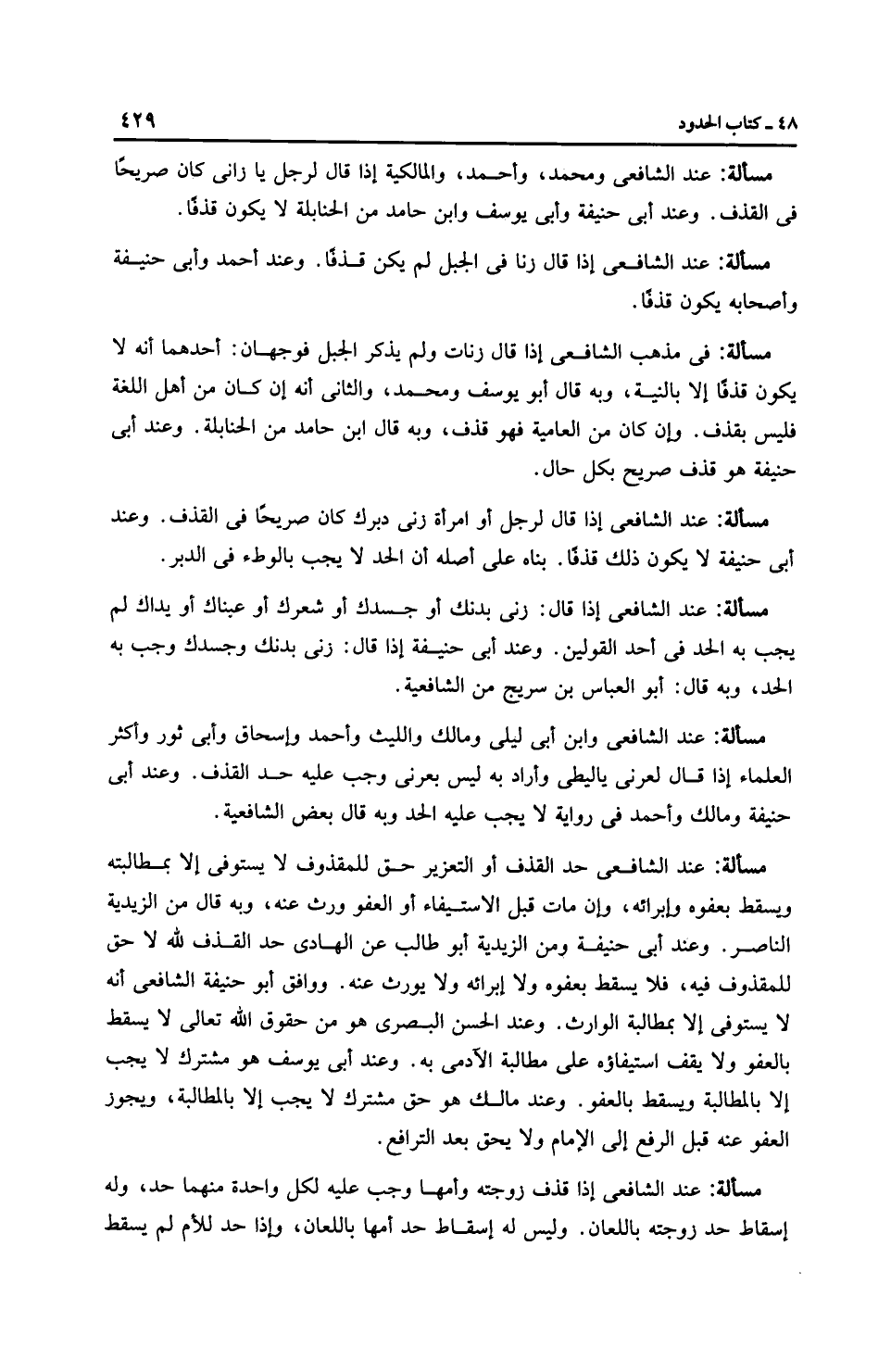 مَسْأَلَةٌ: عِنْدَ الشَّافِعِيِّ ومحمد، وَأَحْمَد، والمالكية إذا قال لرجل يا زاني كان صريحًا فى القذف. وعند أَبِي حَنِيفَةَ وأَبِي يُوسُفَ وابن حامد من الحنابلة لا يكون قذفًا.