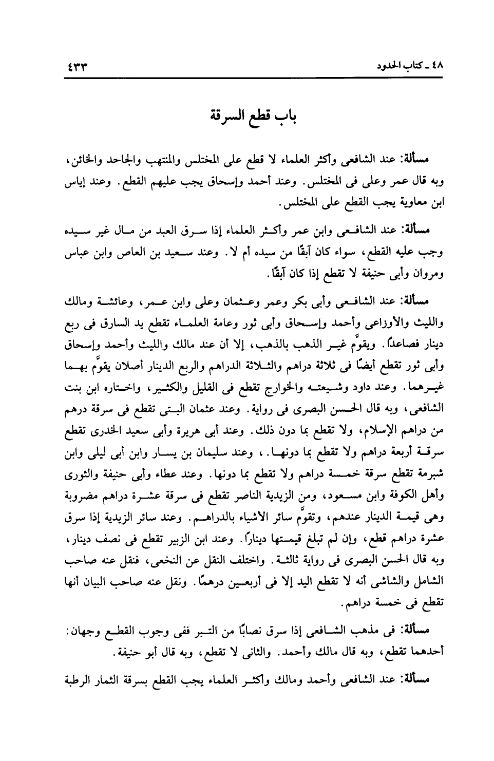 مَسْأَلَةٌ: عِنْدَ الشَّافِعِيِّ وأبي بكر وعمر وعثمان وعلي وابن عمر، وعائشة ومالك واللَّيْث والْأَوْزَاعِيّ وَأَحْمَد وإِسْحَاق وأَبِي ثَورٍ وعامة العلماء تقطع يد السارق في ربع دينار فصاعدًا. ويقوم غير الذهب بالذهب، إلا أن عند مالك واللَّيْث وَأَحْمَد وإِسْحَاق وأَبِي ثَورٍ تقطع أيضًا في ثلاثة دراهم والثلاثة الدراهم والربع الدينار أصلان يقوَّم بهما غيرهما. وعند داود وشيعته والخوارج تقطع في القليل والكثير، واختاره ابن بنت الشَّافِعِيّ، وبه قال الحسن البصري في رِوَايَة. وعند عثمان البتي تقطع في سرقة درهم من دراهم الْإِسْلَام، ولا تقطع بما دون ذلك. وعند أبي هريرة وأبي سعيد الخدري تقطع سرقة أربعة دراهم ولا تقطع بما دونها.، وعند سليمان بن يسار وابن أبي ليلى وابن شُبْرُمَةَ تقطع سرقة خمسة دراهم ولا تقطع بما دونها. وعند عَطَاء وأَبِي حَنِيفَةَ والثَّوْرِيّ وأهل الكوفة وابن مسعود، ومن الزَّيْدِيَّة النَّاصِر تقطع في سرقة عشرة دراهم مضروبة وهي قيمة الدينار عندهم، وتقوَّم سائر الأشياء بالدراهم. وعند سائر الزَّيْدِيَّة إذا سرق عشرة دراهم قطع، وإن لم تبلغ قيمتها دينارًا. وعند ابن الزبير تقطع في نصف دينار، وبه قال الحسن البصري في رِوَايَة ثالثة. واختلف النقل عن النَّخَعِيّ، فنقل عنه صاحب الشامل والشاشي أنه لا تقطع اليد إلا في أربعين درهمًا. ونقل عنه صاحب البيان أنها تقطع في خمسة دراهم.
