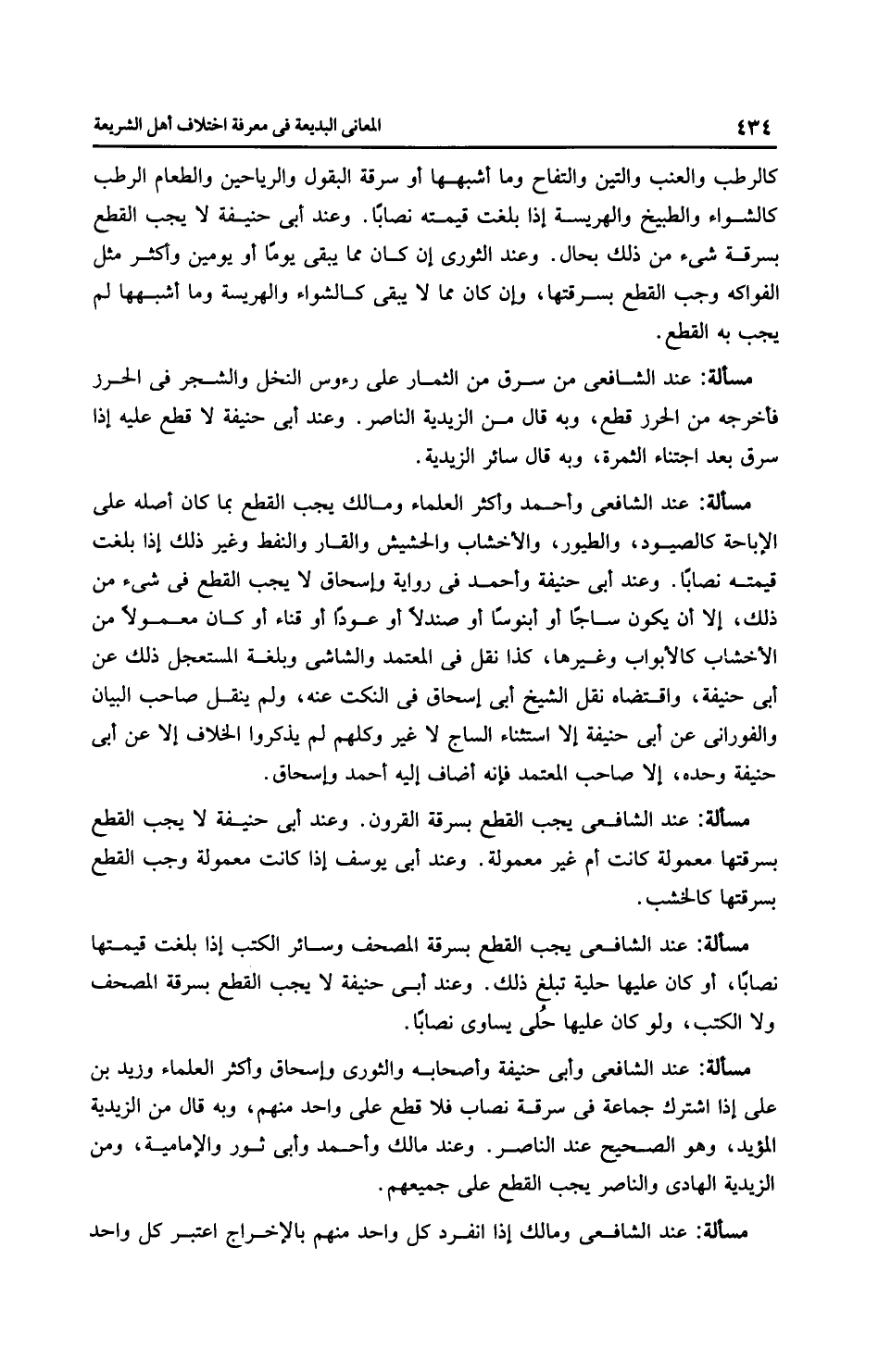 مَسْأَلَةٌ: عِنْدَ الشَّافِعِيِّ وأَبِي حَنِيفَةَ وأصحابه والثَّوْرِيّ وإِسْحَاق وأَكْثَر الْعُلَمَاءِ وزيد بن علي إذا اشترك جماعة في سرقة نصاب فلا قطع على واحد منهم، وبه قال من الزَّيْدِيَّة المؤيَّد، وهو الصحيح عند النَّاصِر. وعند مالك وَأَحْمَد وأَبِي ثَورٍ والْإِمَامِيَّة، ومن الزَّيْدِيَّة الهادي والنَّاصِر يجب القطع على جميعهم.