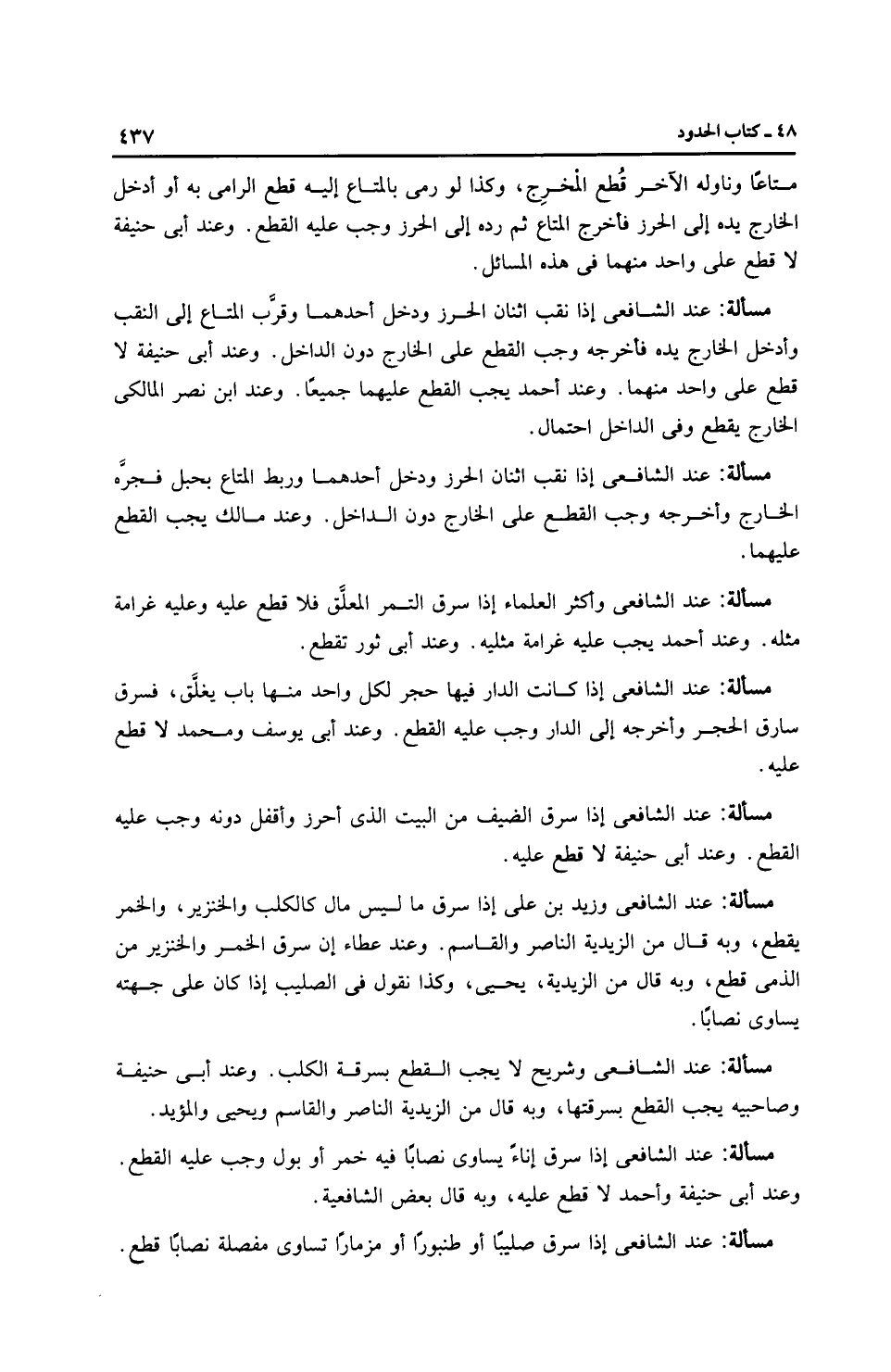 مَسْأَلَةٌ: عِنْدَ الشَّافِعِيِّ إذا نقب اثنان الحرز ودخل أحدهما وقرَّب المتاع إلى النقب وأدخل الخارج يده فأخرجه وجب القطع على الخارج دون الداخل. وعند أبى حَنِيفَةَ لا قطع على واحد منهما. وعند أَحْمَد يجب القطع عليهما جميعًا. وعند ابن نصر المالكي الخارج يقطع وفي الداخل احتمال.