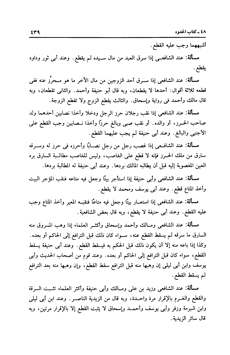 مَسْأَلَةٌ: عِنْدَ الشَّافِعِيِّ إذا سرق أحد الزوجين من مال الآخر ما هو محرَّز عنه ففي قطعه ثلاثة أقوال: أحدها لا يقطعان، وبه قال أبو حَنِيفَةَ وَأَحْمَد. والثاني تقطعان، وبه قال مالك وَأَحْمَد في رِوَايَة وإِسْحَاق. والثالث يقطع الزوج ولا تقطع الزوجة.