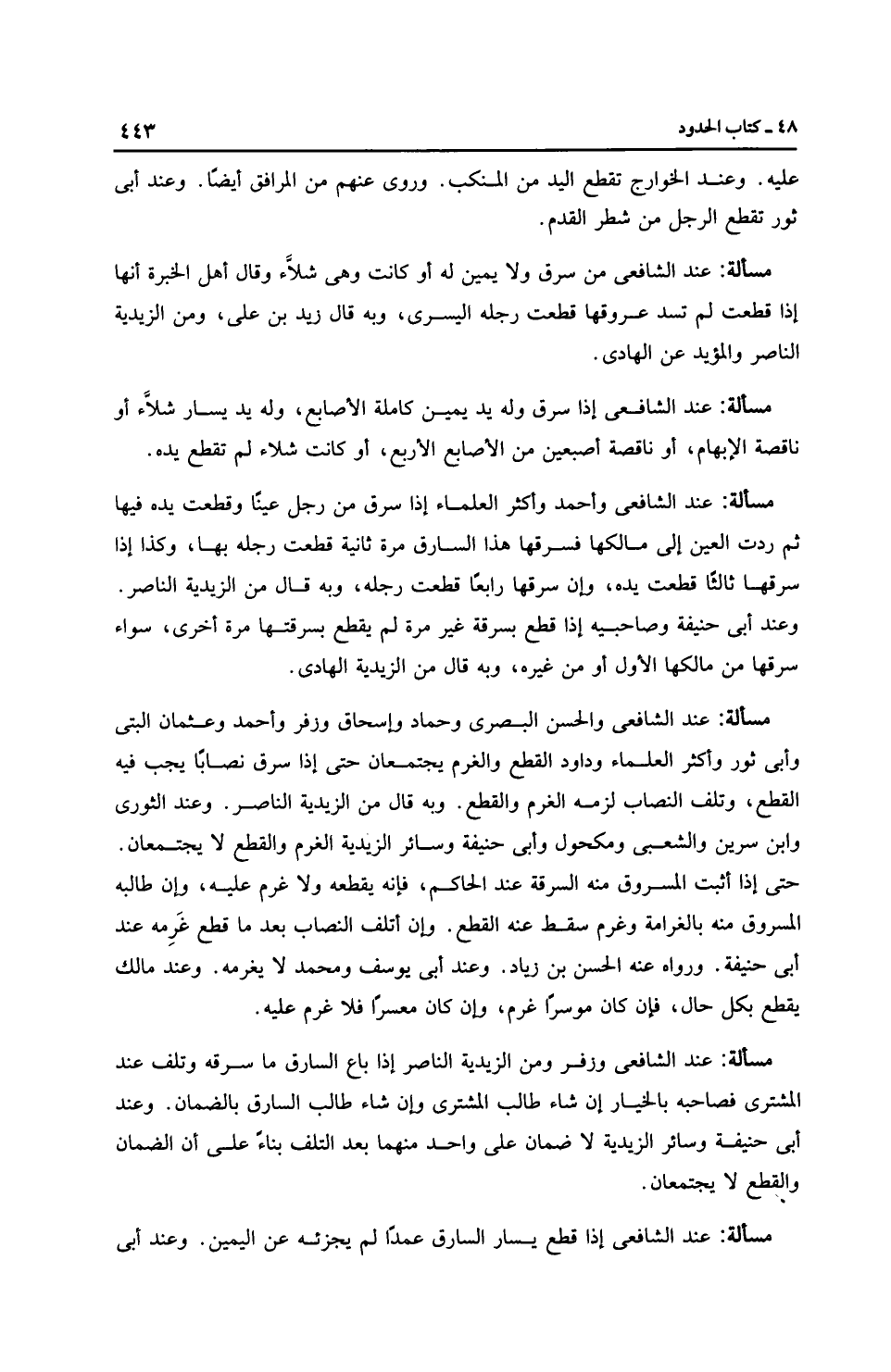 مَسْأَلَةٌ: عِنْدَ الشَّافِعِيِّ وَأَحْمَدَ وأَكْثَر الْعُلَمَاءِ إذا سرق من رجل عينًا وقطعت يده فيها ثم ردت العين إلى مالكها فسرقها هذا السارق مرة ثانية قطعت رجله بها، وكذا إذا سرقها ثالثًا قطعت يده، وإن سرقها رابعًا قطعت رجله، وبه قال من الزَّيْدِيَّة النَّاصِر. وعند أَبِي حَنِيفَةَ وصاحبيه إذا قطع بسرقة غير مرة لم يقطع بسرقتها مرة أخرى، سواء سرقها من مالكها الأول أو من غيره، وبه قال من الزَّيْدِيَّة الهادي.