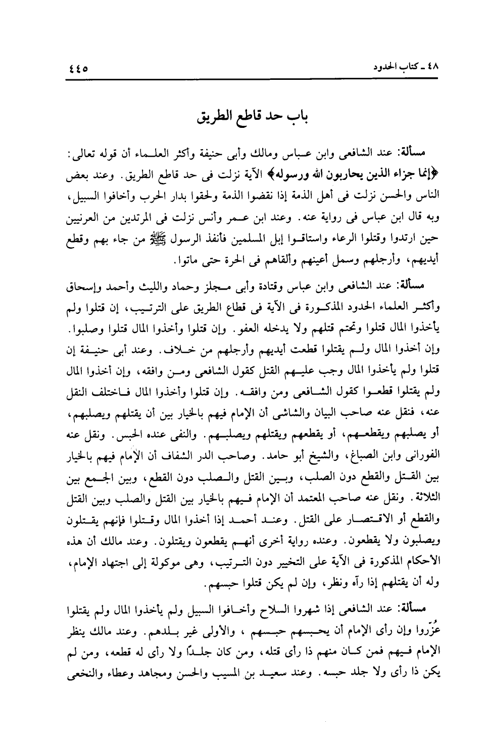 مَسْأَلَةٌ: عِنْدَ الشَّافِعِيِّ وابن عَبَّاسٍ وقتادة وأبي مجلز وحماد واللَّيْث وَأَحْمَد وإِسْحَاق وأَكْثَر الْعُلَمَاءِ الحدود المذكورة في الآية في قطاع الطريق على الترتيب، إن قتلوا ولم يأخذوا المال قتلوا وتحتم قتلهم ولا يدخله العفو. وإن قتلوا وأخذوا المال قتلوا وصلبوا. وإن أخذوا المال ولم يقتلوا قطعت أيديهم وأرجلهم من خلاف. وعند أَبِي حَنِيفَةَ إن قتلوا ولم يأخذوا المال وجب عليهم القتل كقول الشَّافِعِيّ ومن وافقه، وإن أخذوا المال ولم يقتلوا قطعوا كقول الشَّافِعِيّ ومن وافقه. وإن قتلوا وأخذوا المال فاختلف النقل عنه، فنقل عنه صاحب البيان والشاشي أن الإمام فيهم بالخيار بين أن يقتلهم ويصلبهم، أو يصلبهم ويقطعهم، أو يقطعهم ويقتلهم ويصلبهم. والنفي عنده الحبس. ونقل عنه الفوراني وابن الصباغ، والشيخ أبو حامد. وصاحب الدر الشفاف أن الإمام فيهم بالخيار بين القتل والقطع دون الصلب، وبين القتل والصلب دون القطع، وبين الجمع بين الثلاثة. ونقل عنه صاحب المعتمد أن الإمام فيهم بالخيار بين القتل والصلب وبين القتل والقطع أو الاقتصار على القتل. وعند أَحْمَد إذا أخذوا المال وقتلوا فإنهم يقتلون ويصلبون ولا يقطعون. وعنده رِوَايَة أخرى أنهم يقطعون ويقتلون. وعند مالك أن هذه الأحكام المذكورة في الآية على التخيير دون الترتيب، وهي موكولة إلى اجتهاد الإمام، وله أن يقتلهم إذا رآه ونظر، وإن لم يكن قتلوا حبسهم.
