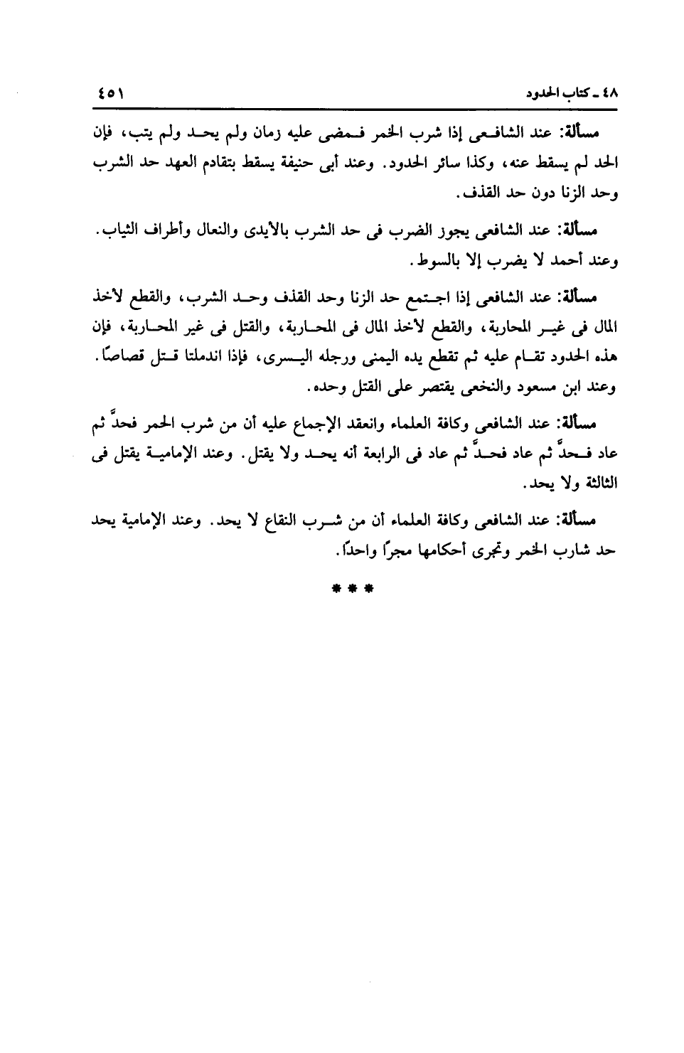 مَسْأَلَةٌ: عِنْدَ الشَّافِعِيِّ وكافة العلماء وانعقد الإجماع عليه أن من شرب الحمر فحدَّ ثم عاد فحدَّ ثم عاد فحدَّ ثم عاد في الرابعة أنه يحد ولا يقتل. وعند الْإِمَامِيَّة يقتل في الثالثة ولا يحد.