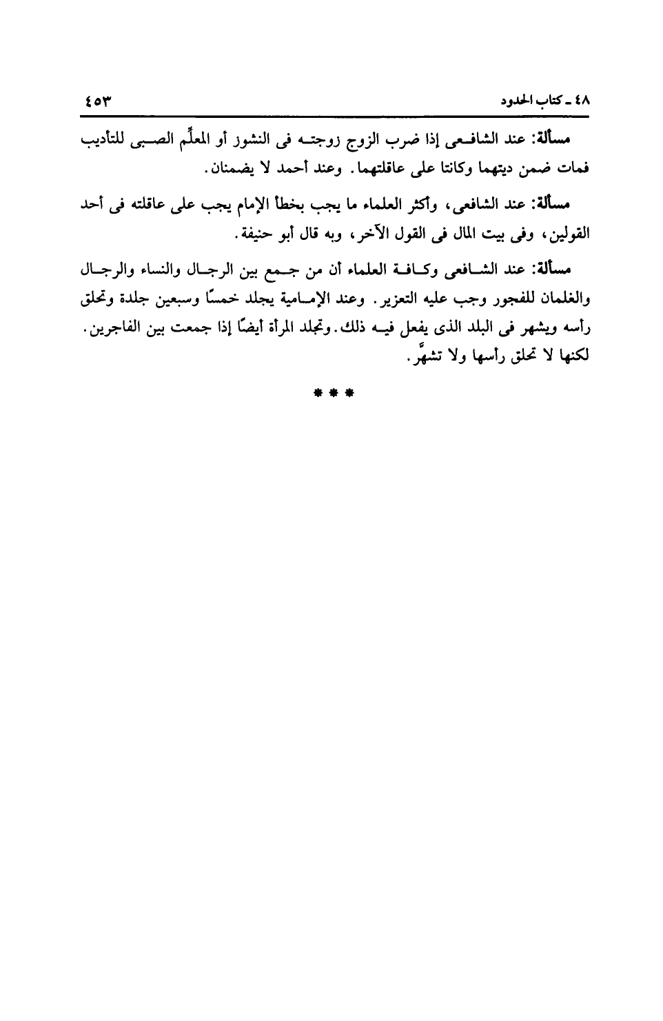 مَسْأَلَةٌ: عِنْدَ الشَّافِعِيِّ إذا ضرب الزوج زوجته في النشور أو المعلِّم الصبي للتأديب فمات ضمن ديتهما وكانتا على عاقلتهما. وعند أَحْمَد لا يضمنان.