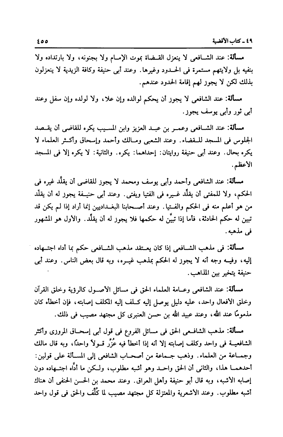 مسألة: مذهب الشَّافِعِيّ الحق في مسائل الفروع في قول أبي إِسْحَاق المروزي وأكثر الشَّافِعِيَّة في واحد وكلف إصابته إلا أنه إذا أخطأ فيه عُزر قولاً واحدًا، وبه قال مالك وجماعة من العلماء. وذهب جماعة من أصحاب الشَّافِعِيّ إلى المسألة على قولين: أحدهما هذا، والثاني أن الحق واحد وهو أشبه مطلوب، ولكن ما أدَّاه اجتهاده دون إصابه الأشبه، وبه قال أبو حَنِيفَةَ وأهل العراق. وعند مُحَمَّد بن الحسن الحنفي أن هناك أشبه مطلوب. وعند الأشعرية والمعتزلة كل مجتهد مصيب لما كُلِّف والحق في قول واحد