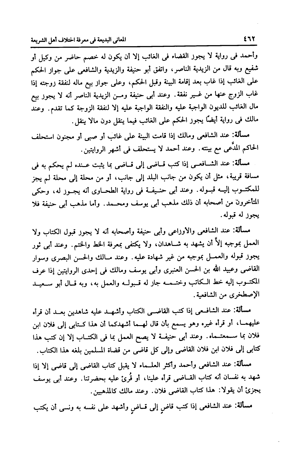 مَسْأَلَةٌ: عِنْدَ الشَّافِعِيِّ إذا كتب القاضي الكتاب وأشهد عليه شاهدين بعد أن قرأه عليهما، أو قرأه غيره وهو يسمع بأن قال لهما أشهدكما أن هذا كتابي إلى فلان ابن فلان بما سمعتماه. وعند أَبِي حَنِيفَةَ لا يصح العمل بما في الكتاب إلا إن كتب هذا كتابي إلى فلان ابن فلان القاضي وإلى كل قاض من قضاة المسلمين بلغه هذا الكتاب.