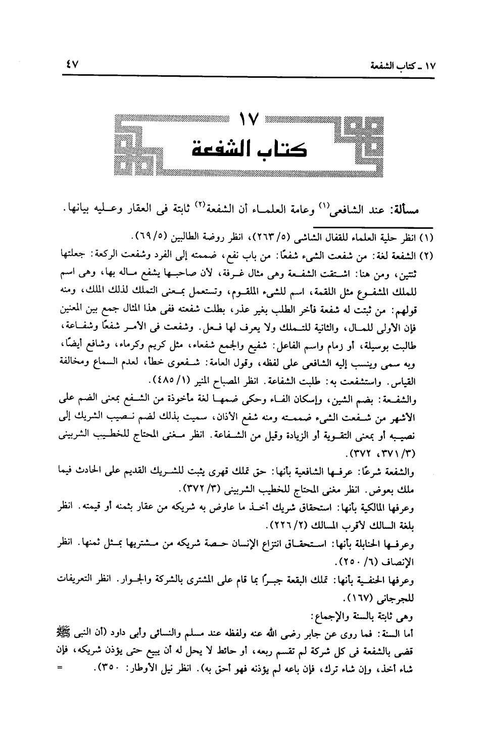 مَسْأَلَةٌ: عِنْدَ الشَّافِعِيِّ وعامة العلماء أن الشفعة ثابتة في العقار وعليه بيانها.