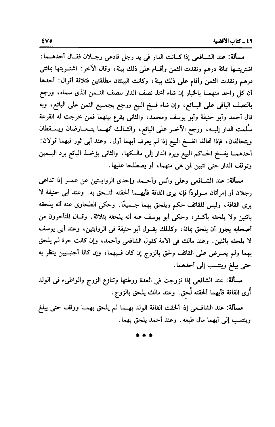 مَسْأَلَةٌ: عِنْدَ الشَّافِعِيِّ وعلي وأنس وَأَحْمَد وإحدى الروايتين عن عمر إذا تداعى رجلان أو إمرأتان مولودًا فإنه يرى القافة فأيهما ألحقته التحق به. وعند أَبِي حَنِيفَةَ لا يرى القافة، وليس للقائف حكم ويلحق بهما جميعًا. وحكى الطحاوي عنه أنه يلحقه باثنين ولا يلحقه بأكثر، وحكى أبو يوسف عنه أنه يلحقه بثلاثة. وقال المتأخرون من أصحابه يجوز أن يلحق بمائة، وكذلك يقول أبو حَنِيفَةَ في الروايتين، وعند أَبِي يُوسُفَ لا يلحقه باثنين. وعند مالك في الأمة كقول الشَّافِعِيّ وَأَحْمَد، وإن كانت حرة لم يلحق بهما ولم يعرض على القائف ولحق بالزوج إن كان فيهما، وإن كانا أجنبيين ينظر به حتى يبلغ وينتسب إلى أحدهما.