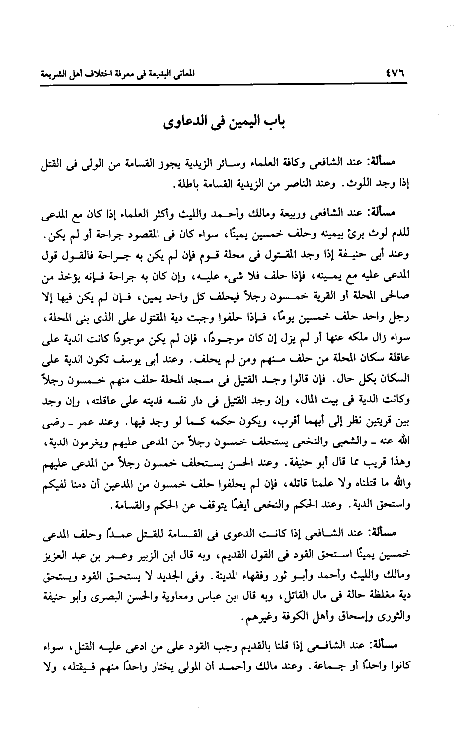 مَسْأَلَةٌ: عِنْدَ الشَّافِعِيِّ إذا كانت الدعوى في القسامة للقتل عمدًا وحلف المدّعي خمسين يمينًا استحق القود في القول القديم، وبه قال ابن الزبير وعمر بن عبد العزيز وَمَالِك واللَّيْث وَأَحْمَد وأبو ثور وفقهاء المدينة. وفي الجديد لا يستحق القود ويستحق دية مغلظة حالة في مال القاتل، وبه قال ابن عَبَّاسٍ ومعاوية والحسن البصري وأبو حَنِيفَةَ والثَّوْرِيّ وإِسْحَاق وأهل الكوفة وغيرهم.