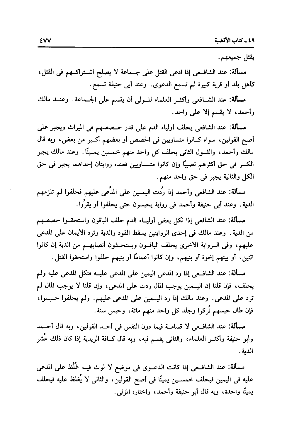مَسْأَلَةٌ: عِنْدَ الشَّافِعِيِّ إذا نكل بعض أولياء الدم حلف الباقون واستحقوا حصصهم من الدية. وعند مالك في إحدى الروايتين يسقط القود والدية وترد الأيمان على المدّعى عليهم، وفي الرِوَايَة الأخرى يحلف الباقون ويستحقون أنصابهم من الدية إن كانوا اثنين، أو بينهم إخوة أو بنيهم، وإن كانوا أعمامًا أو بنيهم حلفوا واستحقوا القتل.