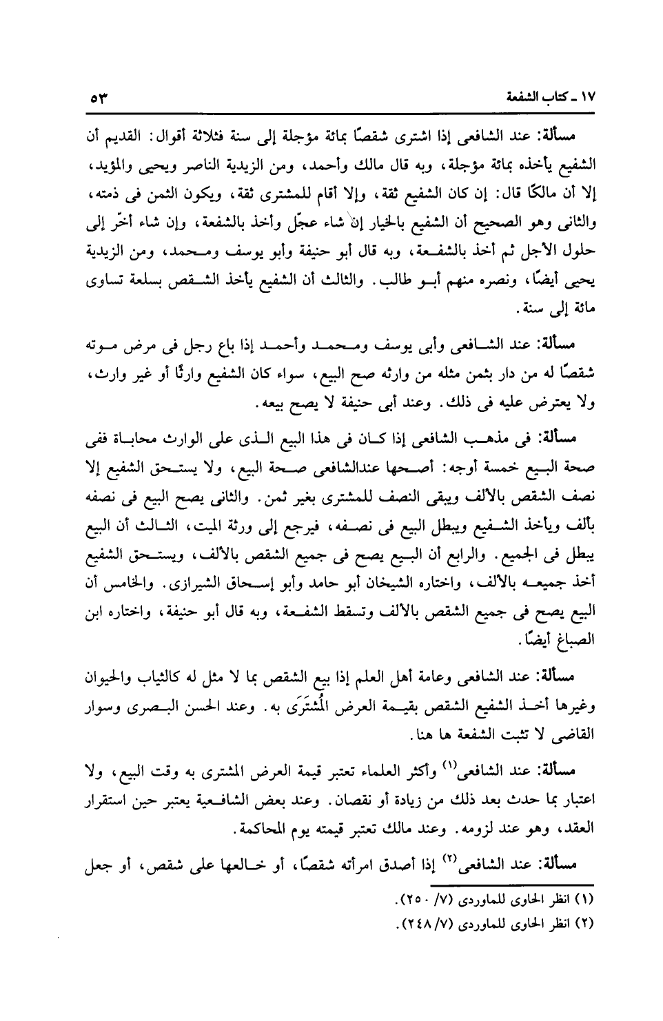 مَسْأَلَةٌ: عِنْدَ الشَّافِعِيِّ وعامة أهل العلم إذا بيع الشقص بما لا مثل له كالثياب والحيوان وغيرها أخذ الشفيع الشقص بقيمة العرض المُشتَرَى به. وعند الحسن البصري وسوار القاضي لا تثبت الشفعة ها هنا.