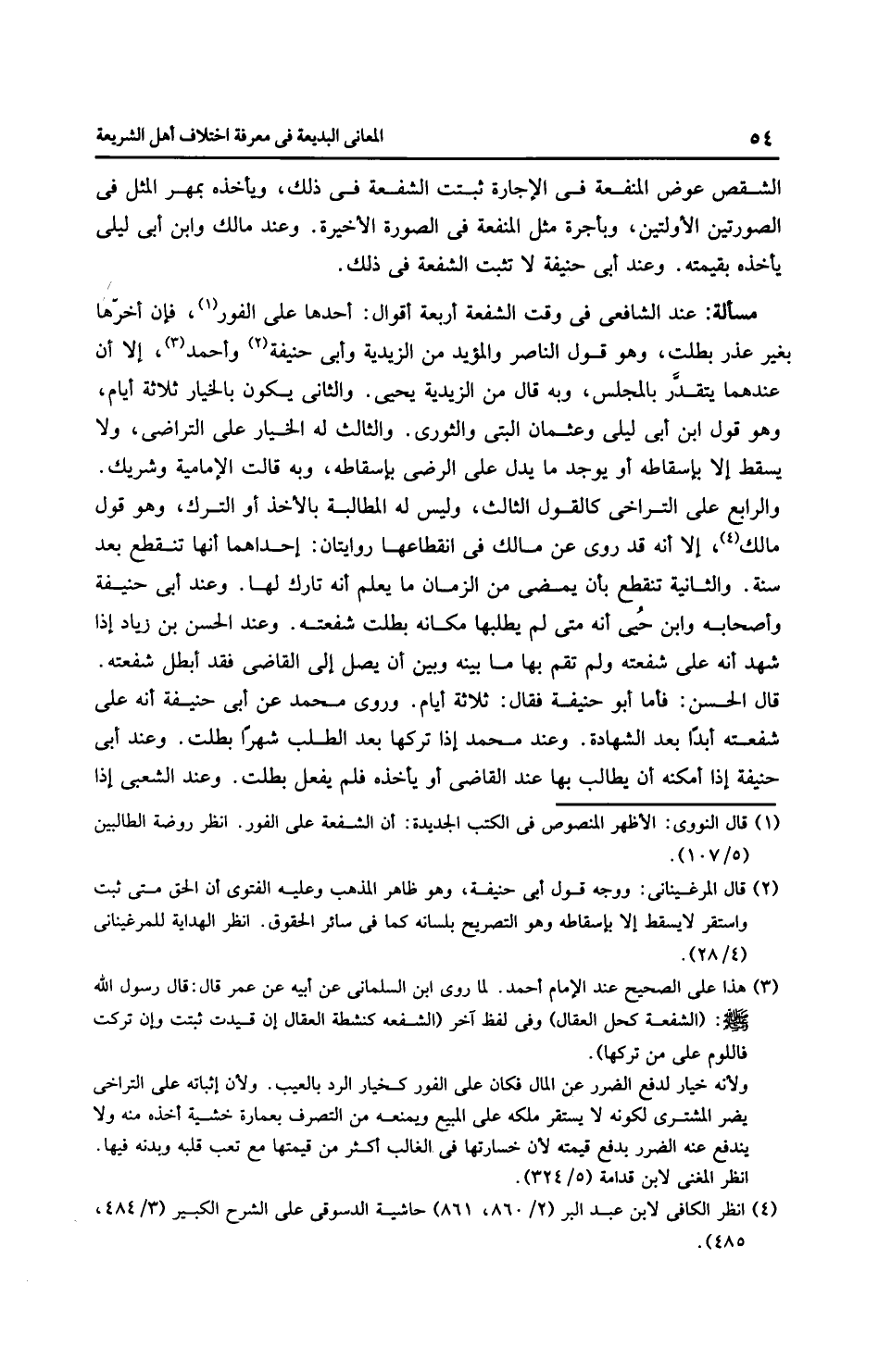 مَسْأَلَةٌ: عِنْدَ الشَّافِعِيِّ في وقت الشفعة أربعة أقوال: أحدها على الفور، فإن أخّرها بغير عذر بطلت، وهو قول النَّاصِر والمؤيَّد من الزَّيْدِيَّة وأَبِي حَنِيفَةَ وَأَحْمَد، إلا أن عندهما يتقدَّر بالمجلس، وبه قال من الزَّيْدِيَّة يَحْيَى. والثاني يكون بالخيار ثلاثة أيام، وهو قول ابن أبي ليلى وعثمان البتي والثَّوْرِيّ. والثالث له الخيار على التراضي، ولا يسقط إلا بإسقاطه أو يوجد ما يدل على الرضى بإسقاطه، وبه قالت الْإِمَامِيَّة وشريك. والرابع على التراخي كالقول الثالث، وليس له المطالبة بالأخذ أو الترك، وهو قول مالك، إلا أنه قد روى عن مالك في انقطاعها رِوَايَتَانِ: إحداهما أنها تنقطع بعد سنة. والثانية تنقطع بأن يمضي من الزمان ما يعلم أنه تارك لها. وعند أَبِي حَنِيفَةَ وأصحابه وابن حُيي أنه متى لم يطلبها مكانه بطلت شفعته. وعند الحسن بن زياد إذا شهد أنه على شفعته ولم تقم بها ما بينه وبين أن يصل إلى القاضي فقد أبطل شفعته. قال الحسن: فأمَّا أبو حَنِيفَةَ فقال: ثلاثة أيام. وروى مُحَمَّد عن أَبِي حَنِيفَةَ أنه على شفعته أبدًا بعد الشهادة. وعند مُحَمَّد إذا تركها بعد الطلب شهرًا بطلت. وعند أبي حَنِيفَةَ إذا أمكنه أن يطالب بها عند القاضي أو يأخذه فلم يفعل بطلت. وعند الشعبي إذا