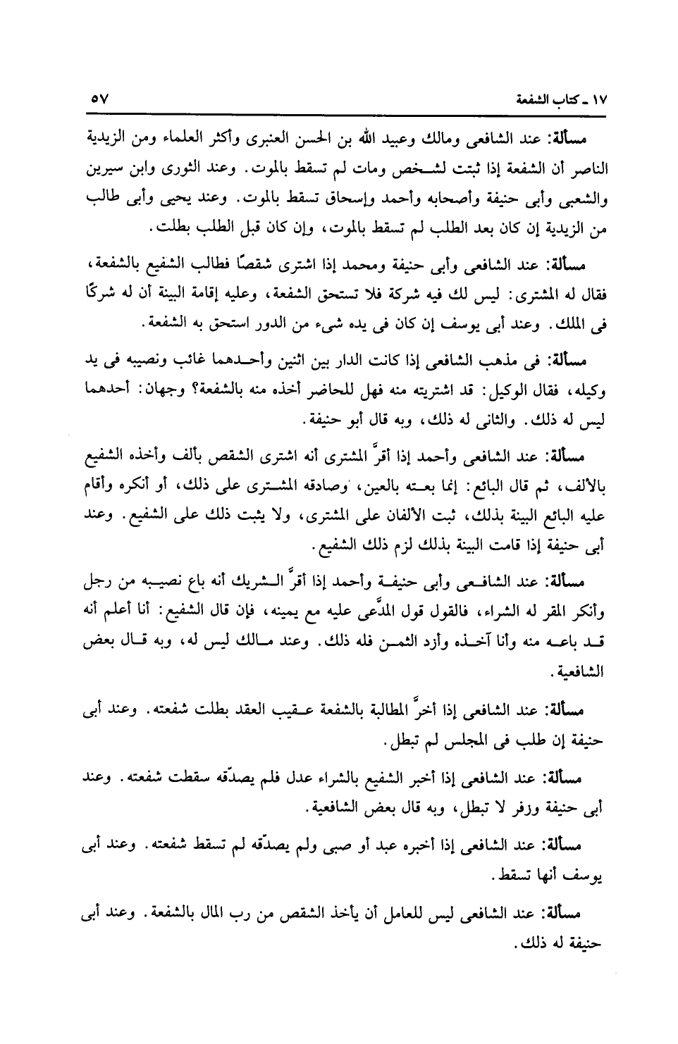 مَسْأَلَةٌ: عِنْدَ الشَّافِعِيِّ وأَبِي حَنِيفَةَ ومُحَمَّد إذا اشترى شقصًا فطالب الشفيع بالشفعة، فقال له المشتري: ليس لك فيه شركة فلا تستحق الشفعة، وعليه إقامة البينة أن له شركًا فى الملك. وعند أَبِي يُوسُفَ إن كان في يده شيء من الدور استحق به الشفعة.