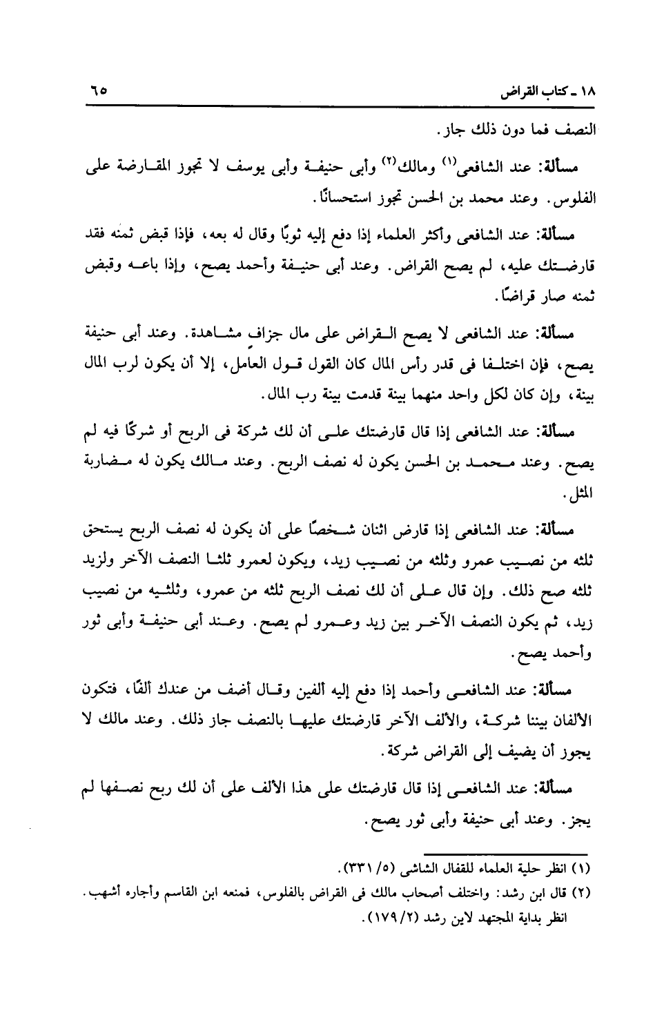 مَسْأَلَةٌ: عِنْدَ الشَّافِعِيِّ وَمَالِك وأَبِي حَنِيفَةَ وأَبِي يُوسُفَ لا تجوز المقارضة على الفلوس. وعند مُحَمَّد بن الحسن تجوز استحسانًا.