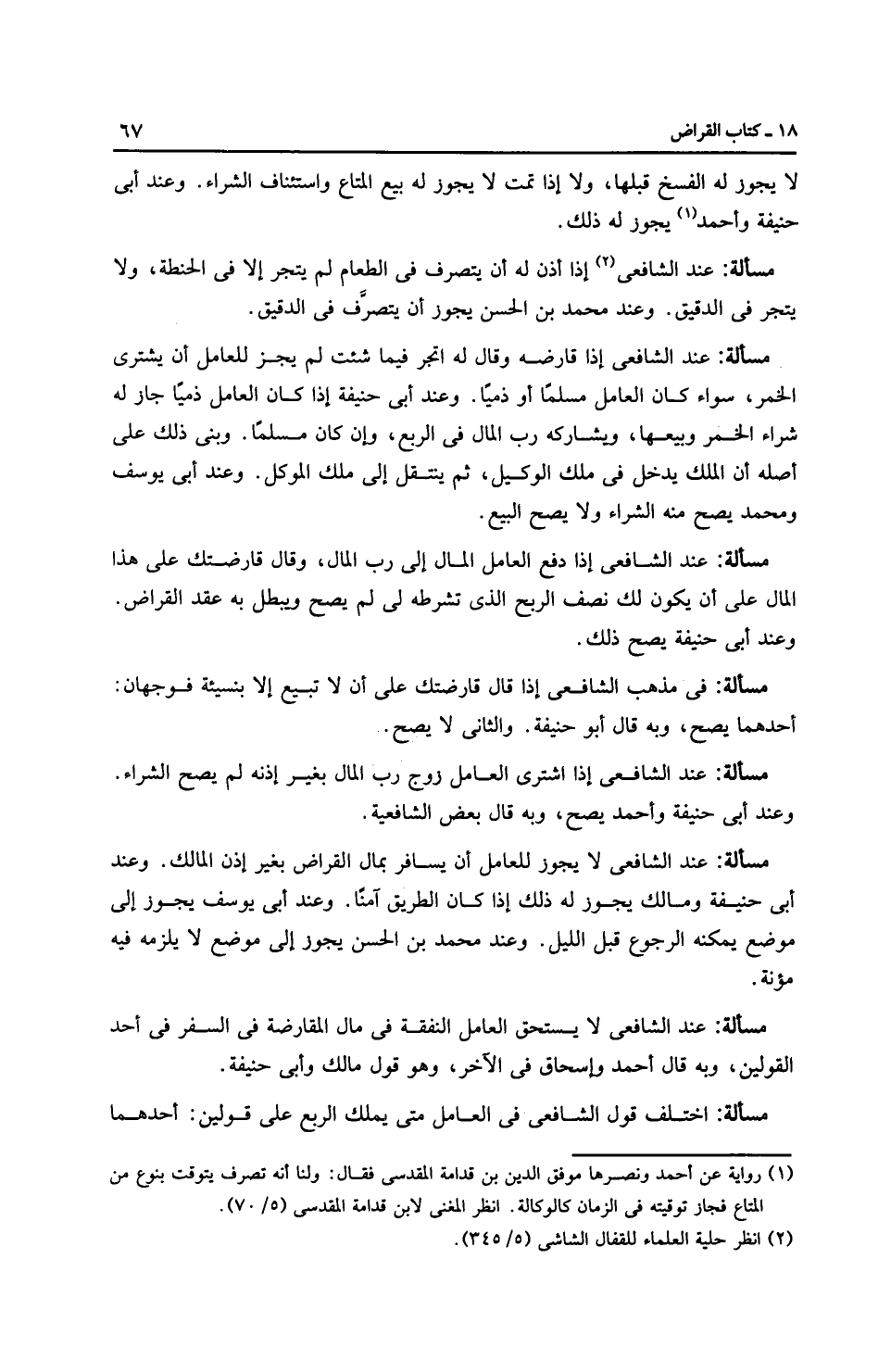 مَسْأَلَةٌ: عِنْدَ الشَّافِعِيِّ لا يجوز للعامل أن يسافر بمال القراض بغير إذن المالك. وعند أَبِي حَنِيفَةَ وَمَالِك يجوز له ذلك إذا كان الطريق آمنًا. وعند أَبِي يُوسُفَ يجوز إلى موضع يمكنه الرجوع قبل الليل. وعند مُحَمَّد بن الحسن يجوز إلى موضع لا يلزمه فيه مؤنة.