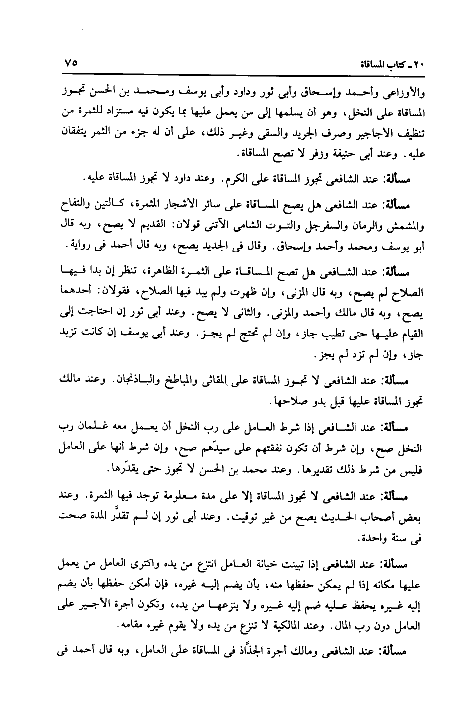 مَسْأَلَةٌ: عِنْدَ الشَّافِعِيِّ تجوز المساقاة على الكرم. وعند داود لا تجوز المساقاة عليه. مَسْأَلَةٌ: عِنْدَ الشَّافِعِيِّ هل يصح المساقاة على سائر الأشجار المثمرة، كالتين والتفاح والمشمش والرمان والسفرجل والتوت الشامي الآتني قَوْلَانِ: القديم لا يصح، وبه قال أبو يوسف ومُحَمَّد وَأَحْمَد وإِسْحَاق. وقال في الجديد يصح، وبه قال أَحْمَد في رِوَايَة.