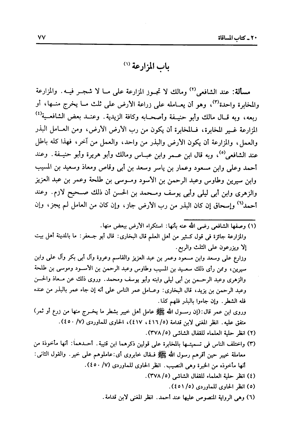 مَسْأَلَةٌ: عِنْدَ الشَّافِعِيِّ وَمَالِك لا تجوز المزارعة على ما لا شجر فيه. والمزارعة والمخابرة واحدة، وهو أن يعامله على زراعة الأرض على ثلث ما يخرج منها، أو ربعه، وبه قال مالك وأبو حَنِيفَةَ وأصحابه وكافة الزَّيْدِيَّة. وعند بعض الشَّافِعِيَّة المزارعة غير المخابرة، فالمخابرة أن يكون من رب الأرض الأرض، ومن العامل البذر والعمل، والمزارعة أن يكون الأرض والبذر من واحد، والعمل من آخر، فهذا كله باطل عند الشَّافِعِيّ، وبه قال ابن عمر وابن عَبَّاسٍ وَمَالِك وأبو هريرة وأبو حَنِيفَةَ. وعند أَحْمَد وعلي وابن مسعود وعمار بن ياسر وسعد بن أبي وقاص ومعاذ وسعيد بن المسيب وابن سِيرِينَ وطاوس وعبد الرحمن بن الأسود وموسى بن طلحة وعمر بن عبد العزيز والزُّهْرِيّ وابن أبي ليلى وأَبِي يُوسُفَ ومُحَمَّد بن الحسن أن ذلك صحيح لازم. وعند أَحْمَد وإِسْحَاق إن كان البذر من رب الأرض جاز، وإن كان من العامل لم يجز، وإن