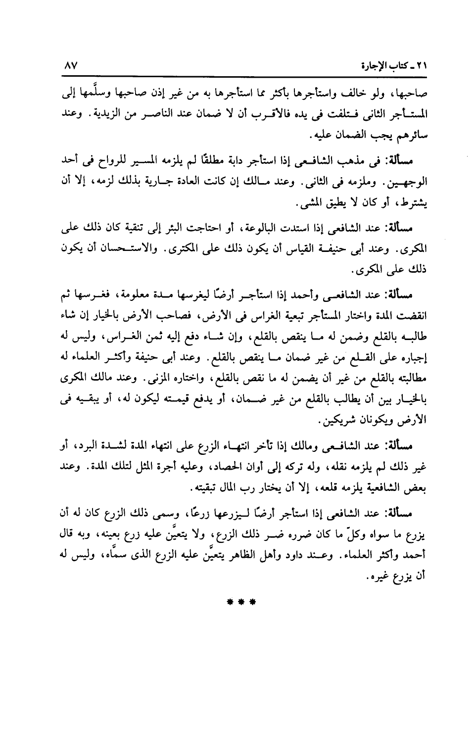 مَسْأَلَةٌ: عِنْدَ الشَّافِعِيِّ إذا استأجر أرضًا ليزرعها زرعًا، وسمى ذلك الزرع كان له أن يزرع ما سواه وكل ما كان ضرره ضر ذلك الزرع، ولا يتعيَّن عليه زرع بعينه، وبه قال أَحْمَد وأَكْثَر الْعُلَمَاءِ. وعند داود وأهل الظاهر يتعين عليه الزرع الذي سمَّاه، وليس له أن يزرع غيره.