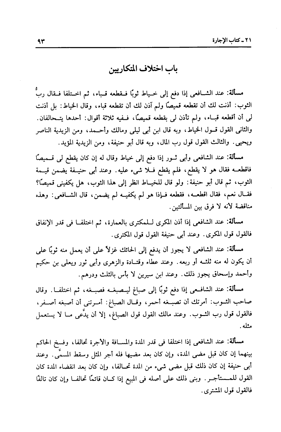مَسْأَلَةٌ: عِنْدَ الشَّافِعِيِّ إذا دفع إلى خياط ثوبًا فقطعه قباء، ثم اختلفا فقال ربُّ الثوب: أذنت لك أن تقطعه قميصًا ولم آذن لك أن تقطعه قباء، وقال الخياط: بل أذنت لي أن أقطعه قباء، ولم تأذن لي بقطعه قميصًا، ففيه ثلاثة أقوال: أحدها يتحالفان. والثاني القول قول الخياط، وبه قال ابن أبي ليلى وَمَالِك وَأَحْمَد، ومن الزَّيْدِيَّة النَّاصِر ويَحْيَى. والثالث القول قول رب المال، وبه قال أبو حَنِيفَةَ، ومن الزَّيْدِيَّة المؤيَّد.