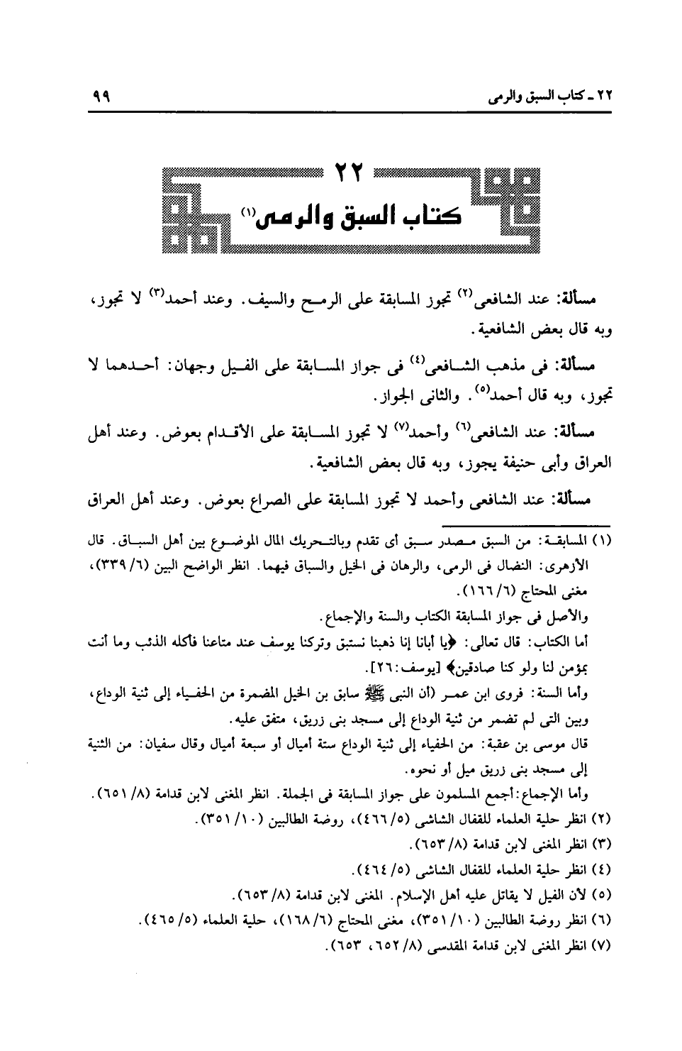 مَسْأَلَةٌ: عِنْدَ الشَّافِعِيِّ وَأَحْمَدَ لا تجوز المسابقة على الأقدام بعوض. وعند أهل العراق وأَبِي حَنِيفَةَ يجوز، وبه قال بعض الشَّافِعِيَّة.