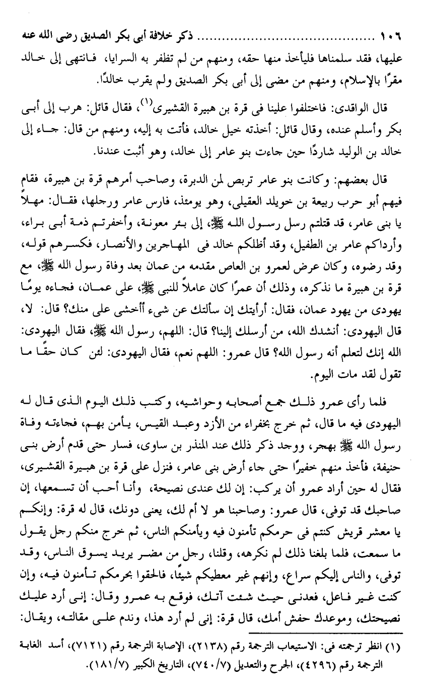 قال الواقدى: فاختلفوا علينا فى قرة بن هبيرة القشيرى «1» ، فقال قائل: هرب إلى أبى بكر وأسلم عنده، وقال قائل: أخذته خيل خالد، فأتت به إليه، ومنهم من قال: جاء إلى خالد بن الوليد شاردا حين جاءت بنو عامر إلى خالد، وهو أثبت عندنا.