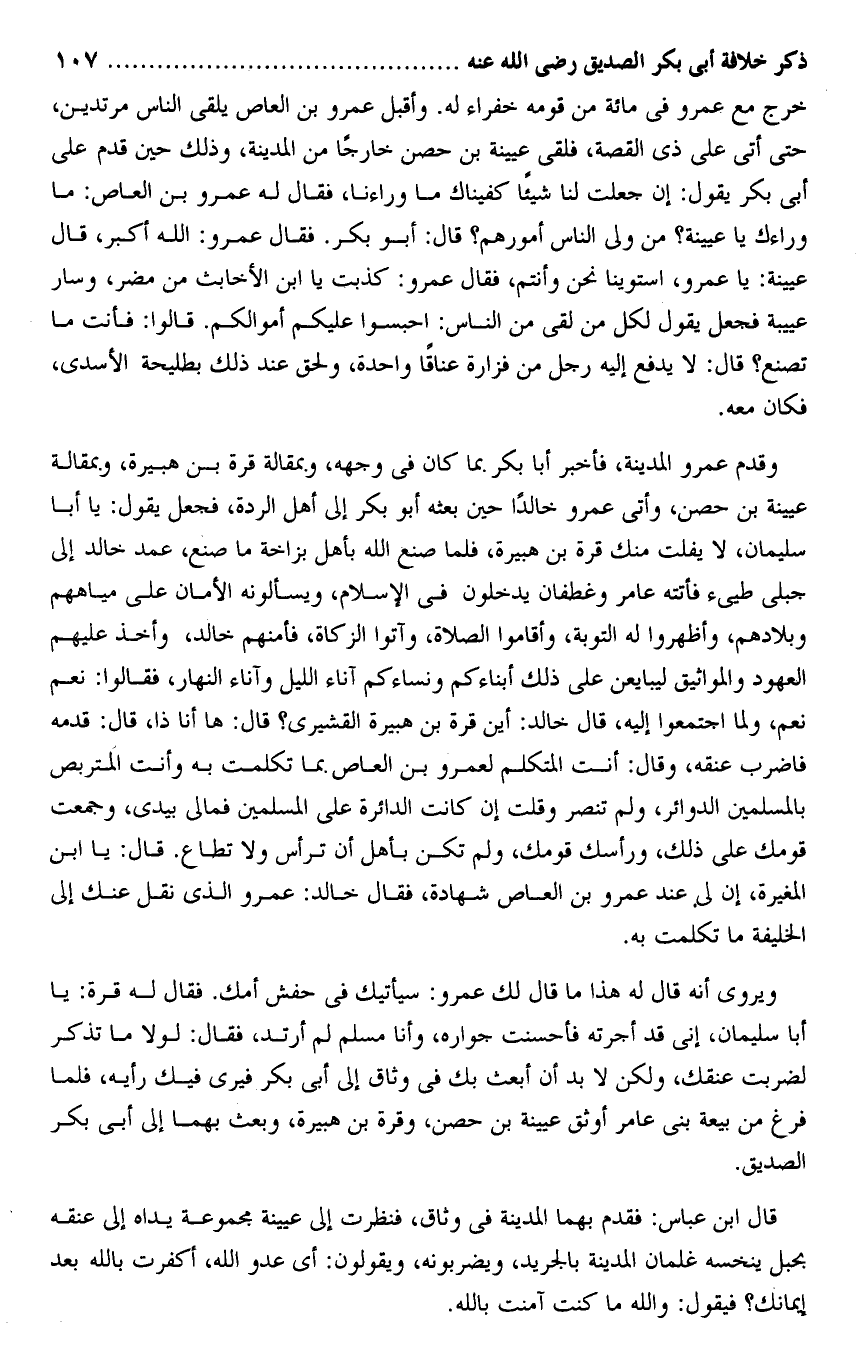 خرج مع عمرو فى مائة من قومه خفراء له. وأقبل عمرو بن العاص يلقى الناس مرتدين، حتى أتى على ذى القصة، فلقى عيينة بن حصن خارجا من المدينة، وذلك حين قدم على أبى بكر يقول: إن جعلت لنا شيئا كفيناك ما وراءنا، فقال له عمرو بن العاص: ما وراءك يا عيينة؟ من ولى الناس أمورهم؟ قال: أبو بكر. فقال عمرو: الله أكبر، قال عيينة: يا عمرو، استوينا نحن وأنتم، فقال عمرو: كذبت يا ابن الأخابث من مضر، وسار عيينة فجعل يقول لكل من لقى من الناس: احبسوا عليكم أموالكم. قالوا: فأنت ما تصنع؟ قال: لا يدفع إليه رجل من فزارة عناقا واحدة، ولحق عند ذلك بطليحة الأسدى، فكان معه.