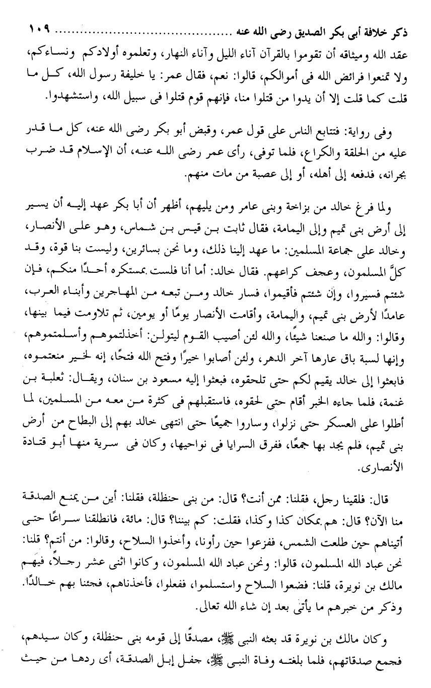 وكان مالك بن نويرة قد بعثه النبى صلى الله عليه وسلم، مصدقا إلى قومه بنى حنظلة، وكان سيدهم، فجمع صدقاتهم، فلما بلغته وفاة النبى صلى الله عليه وسلم، جفل إبل الصدقة، أى ردها من حيث