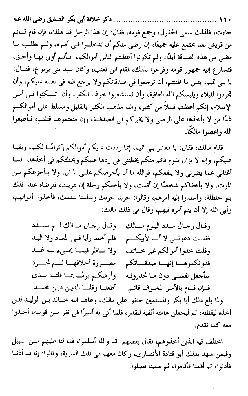 يا بنى تميم، بئس ما ظننتم، أن ترجعوا فى صدقاتكم ولا يرجع الله فى نعمه عليكم، وأن تجردوا للبلاء ويلبسكم الله العافية، وأن تستشعروا خوف الكفر، وأن تسكنوا فى أمن الإسلام، إنكم أعطيتم قليلا من كثير، والله مذهب الكثير بالقليل ومسلط على أموالكم غدا من لا يأخذها على الرضى ولا يخيركم فى الصدقة، وإن منعتموها قتلتم، فأطيعوا الله واعصوا مالكا.