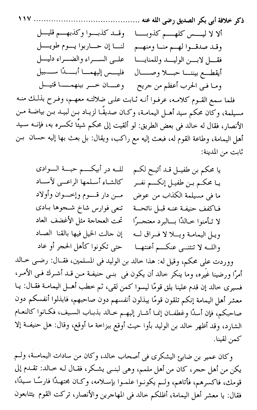 ووردت على محكم، وقيل له: هذا خالد بن الوليد فى المسلمين، فقال: رضى خالد أمرا ورضينا غيره، وما ينكر خالد أن يكون فى بنى حنيفة من قد أشرك فى الأمر، فسيرى خالد إن قدم علينا يلق قوما ليسوا كمن لقى، ثم خطب أهل اليمامة فقال: يا معشر أهل اليمامة إنكم تلقون قوما يبذلون أنفسهم دون صاحبهم، فابذلوا أنفسكم دون صاحبكم، فإن أسدا وغطفان إنما أشار إليهم خالد بذباب السيف، فكانوا كالنعام الشارد، وقد أظهر خالد بن الوليد بأوا حيث أوقع ببزاخة ما أوقع، وقال: هل حنيفة إلا كمن لقينا.